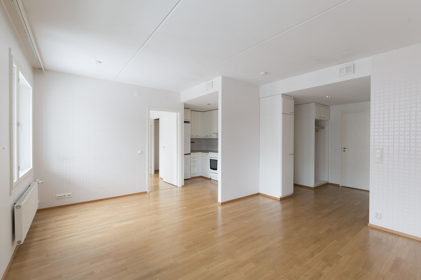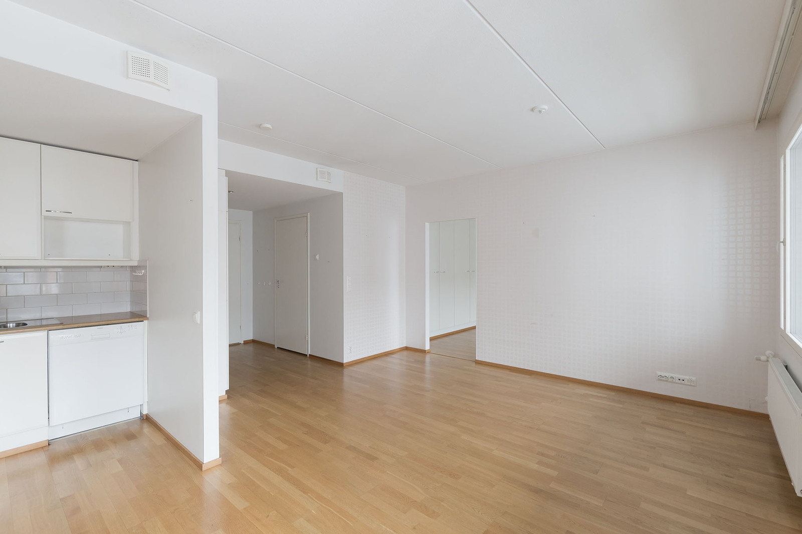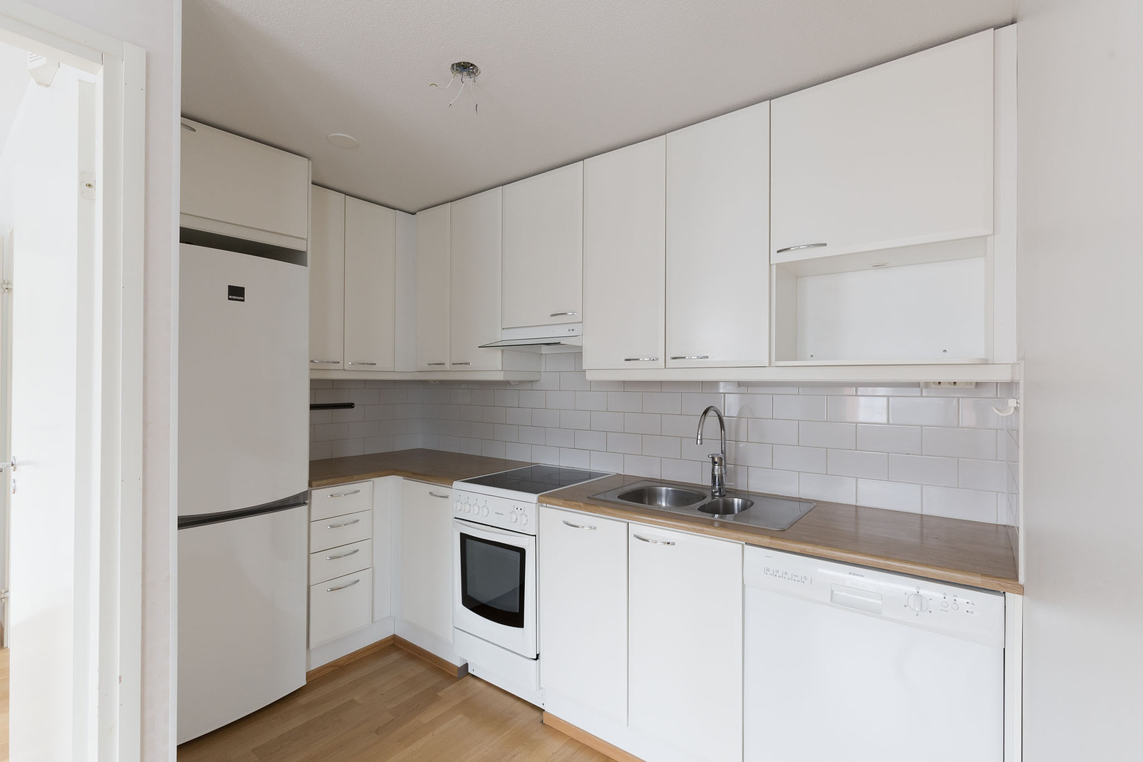 Liesi (Keraaminen liesi), työtasot (laminaatti), seinät (maali ja osalaatoitus), lattiat (parketti), jääkaappipakastin, astianpesukone, liesituuletin ja kiinteät valaisimet |