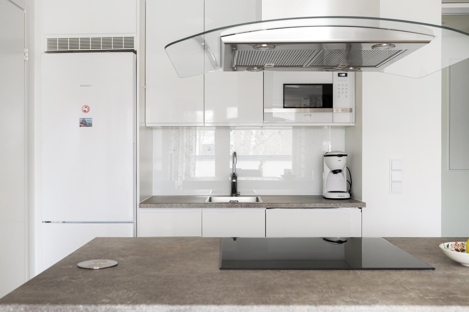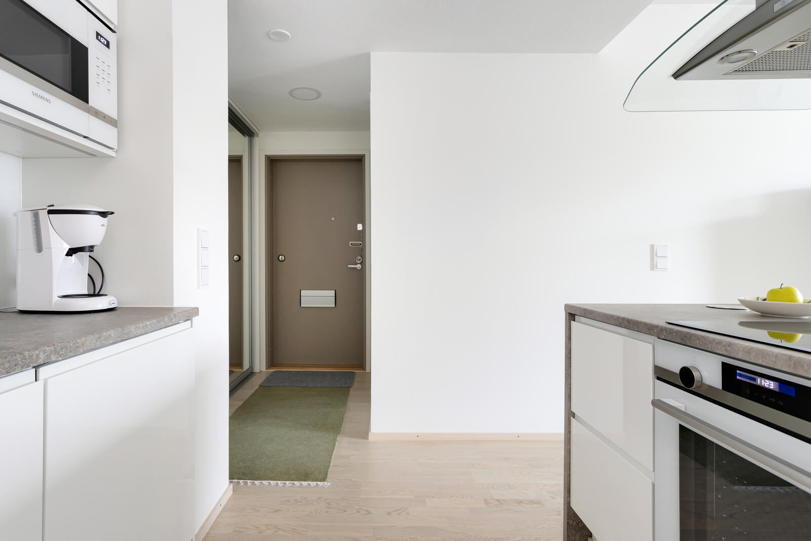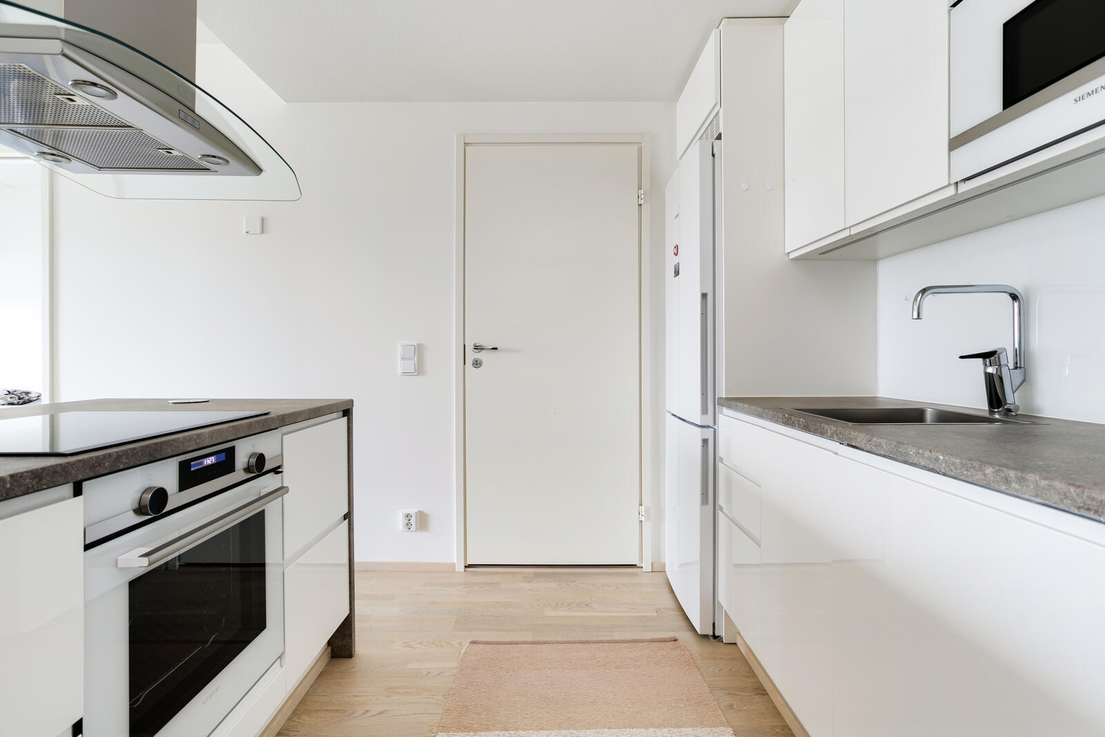 Liesi (Keraaminen liesi ja liesitaso, erillisuuni), työtasot (laminaatti), lattiat (parketti), erillisuuni, mikroaaltouuni, astianpesukone, jääkaappipakastin ja liesitaso, liesituuletin / hormi |