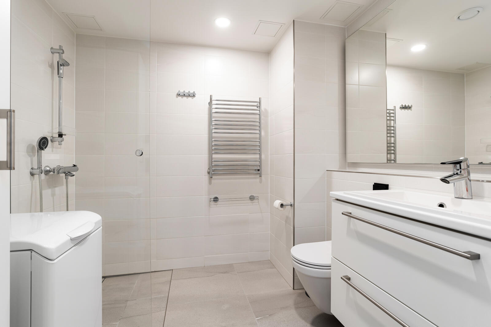 Suihkuseinä, lattialämmitys, suihku, pesukoneliitäntä, wc-istuin, peili ja allaskaappi, seinät (kaakeli), lattiat (laatta) |