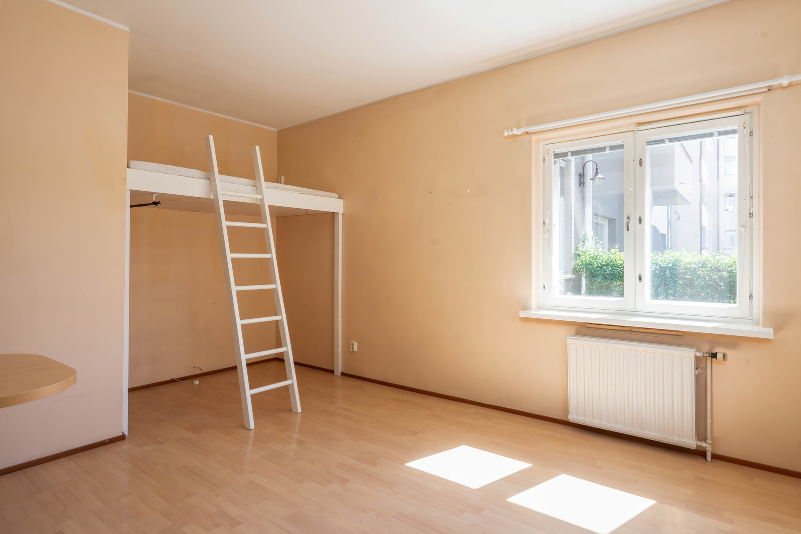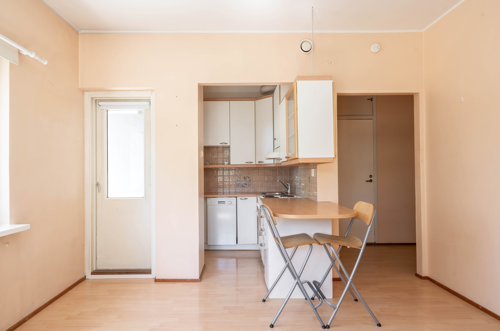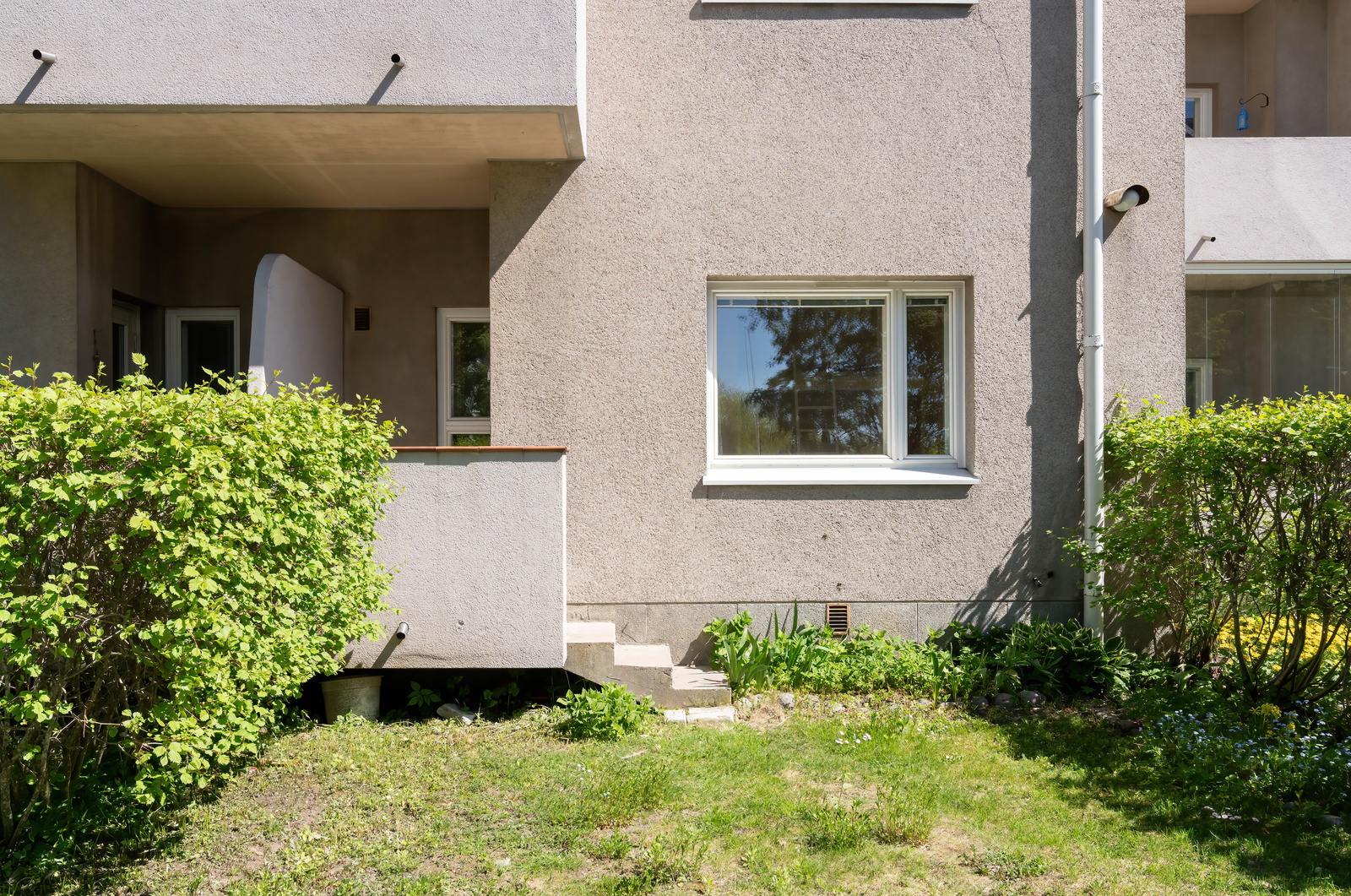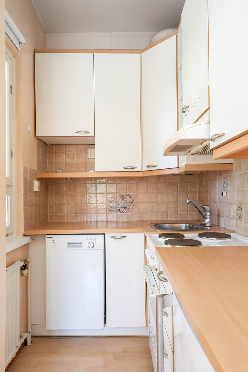 Tässä ensimmäisen kerroksen viehättävässä pikkukodissa ei neliöt kerro koko totuutta. Keittokomerossa on reilusti kaappitilaa ja pienenä luksuksena tistikone, huoneen puolella ikkunat kahteen suuntaan ja boonuksena vielä parvekkeen jatkeena pieni piha.