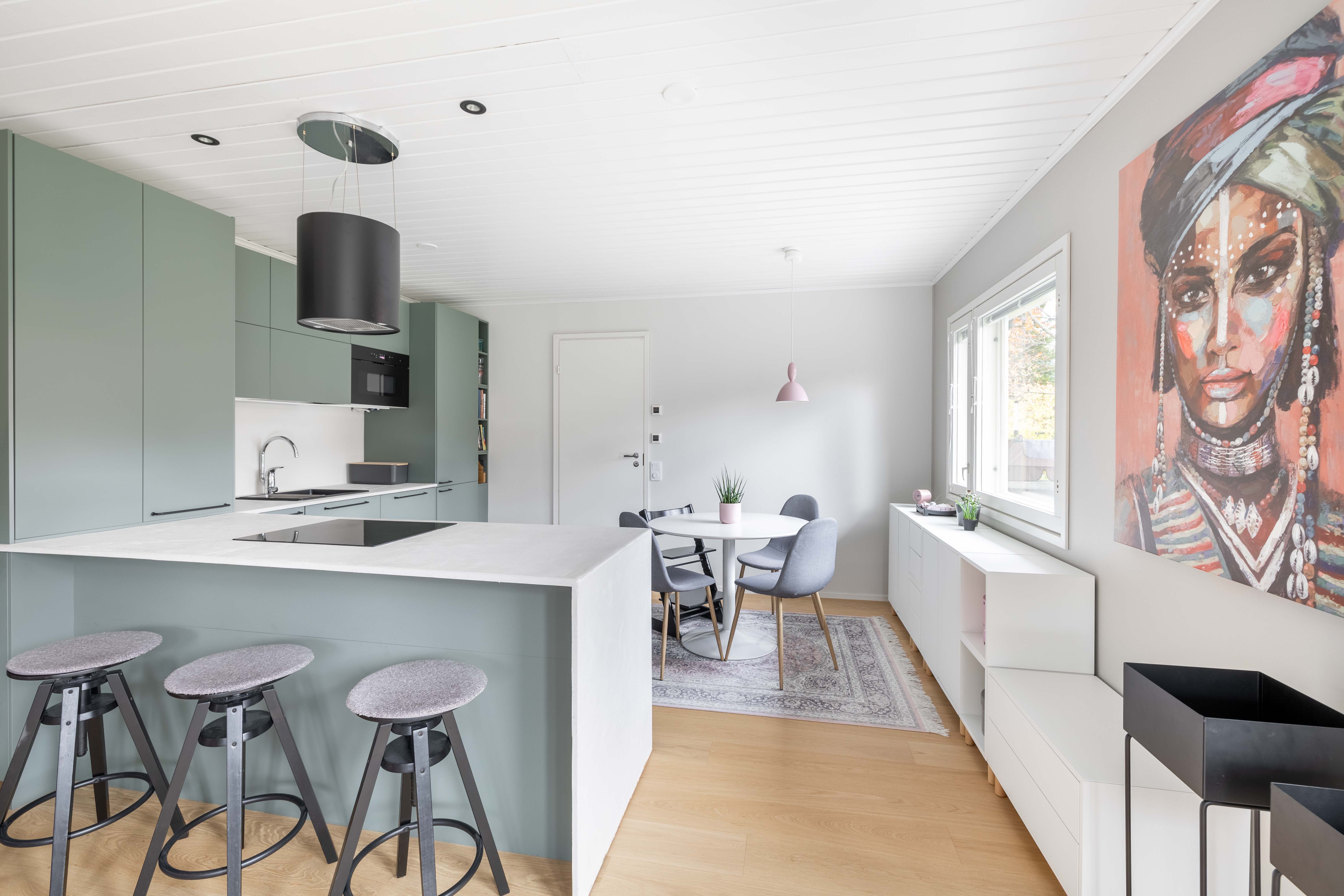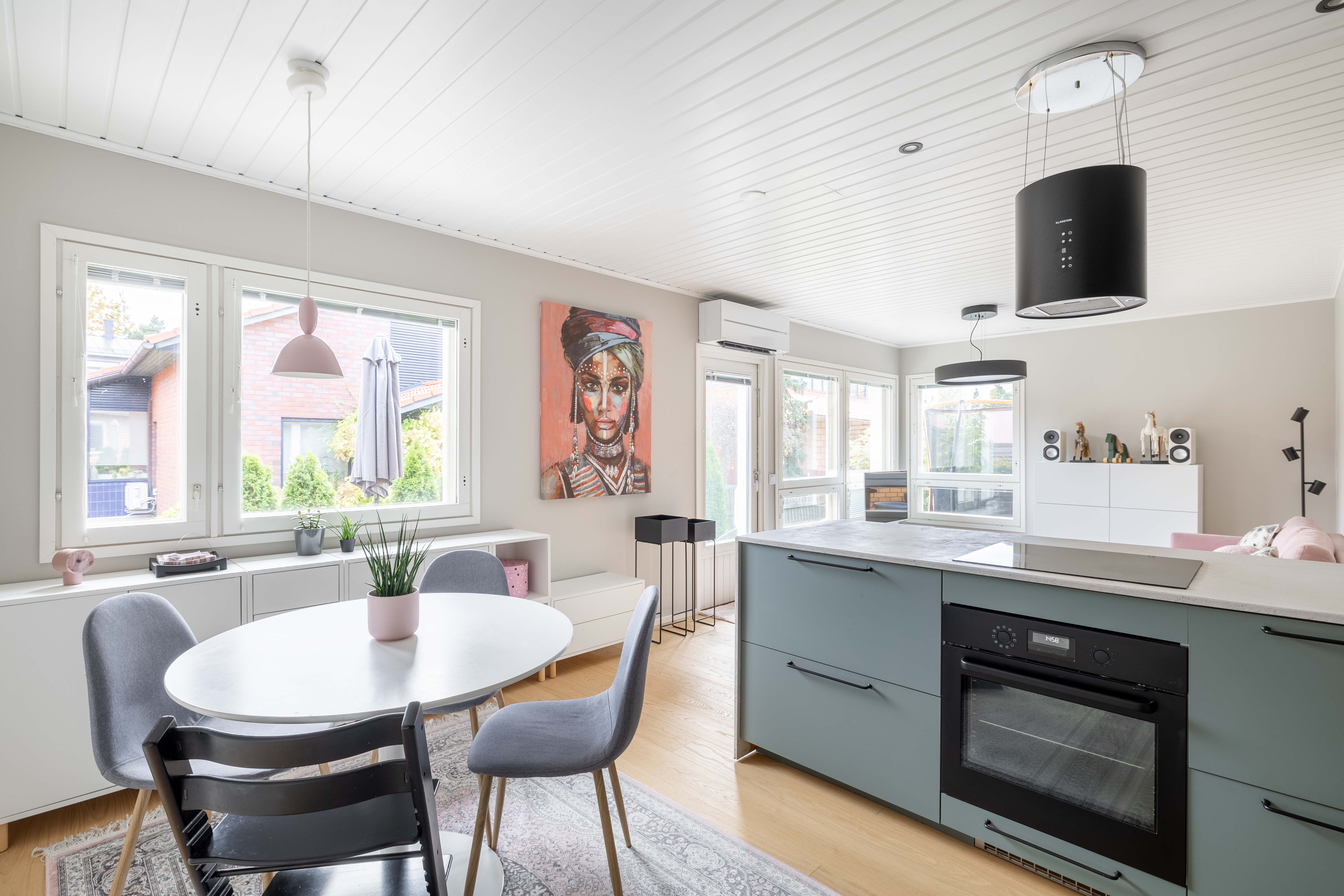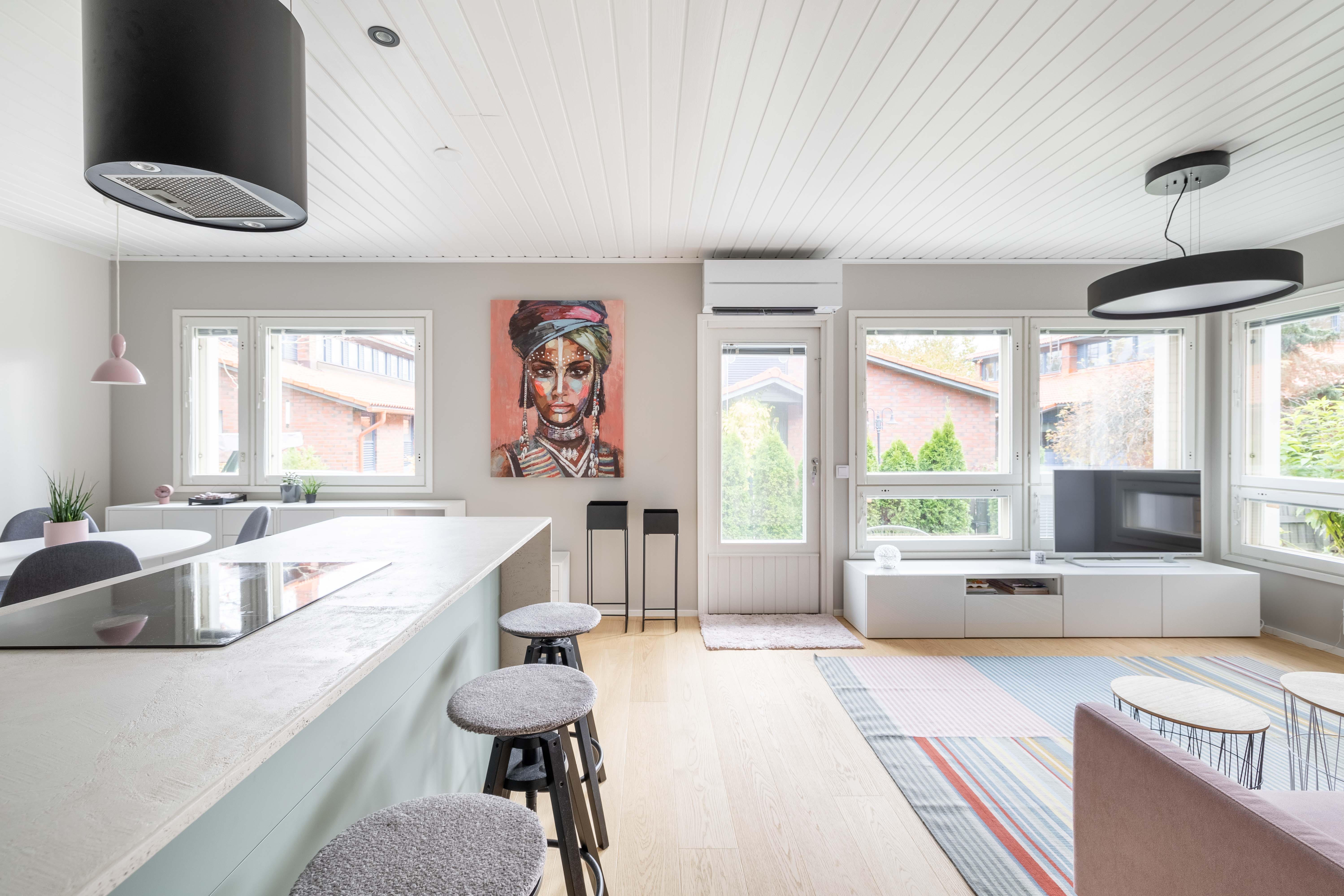 Kodin valoisa olohuone, moderni avokeittiö ja ruokailutila muodostavat kodikkaan ja toimivan kokonaisuuden, josta on kulku suojaisalle piha-alueelle.