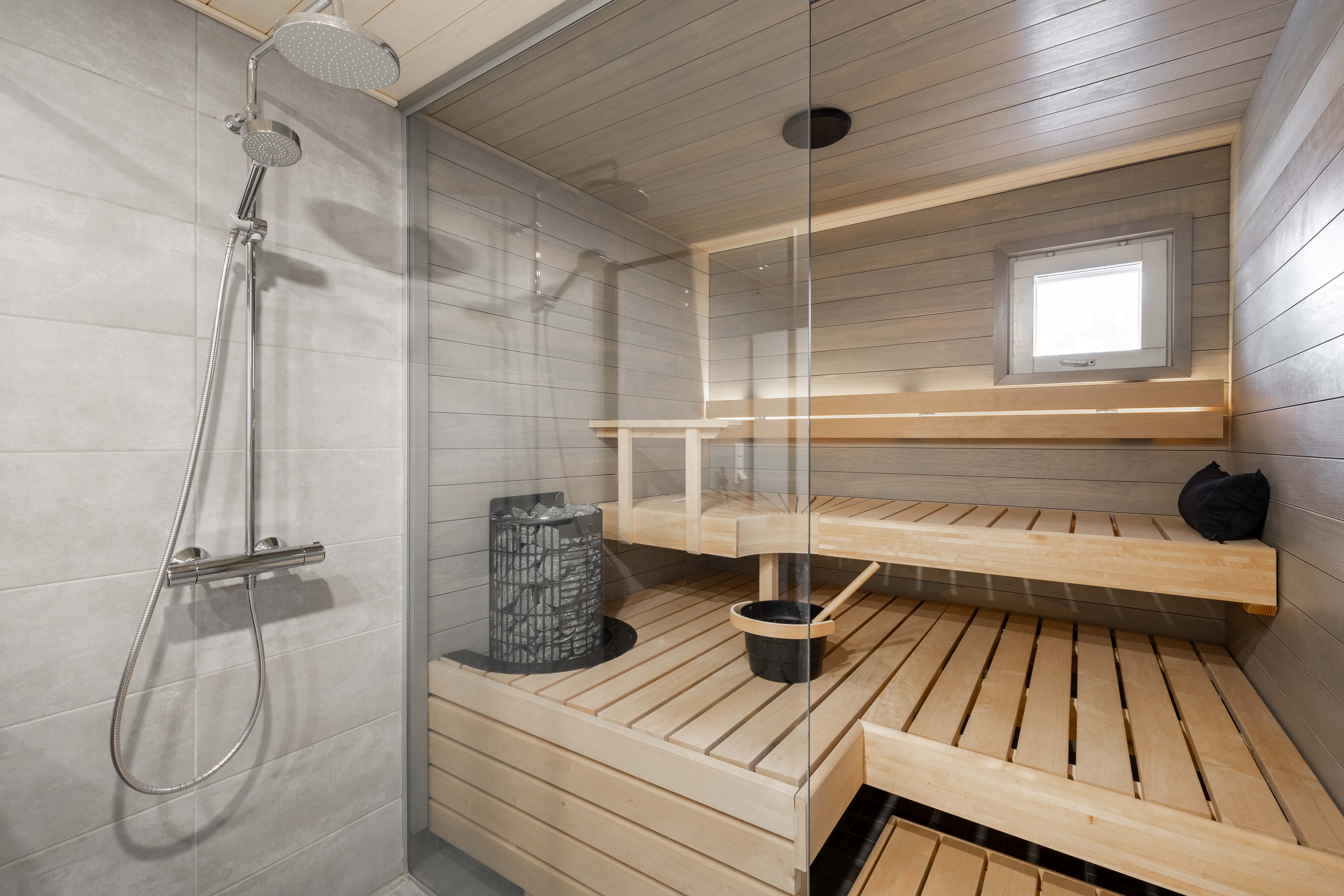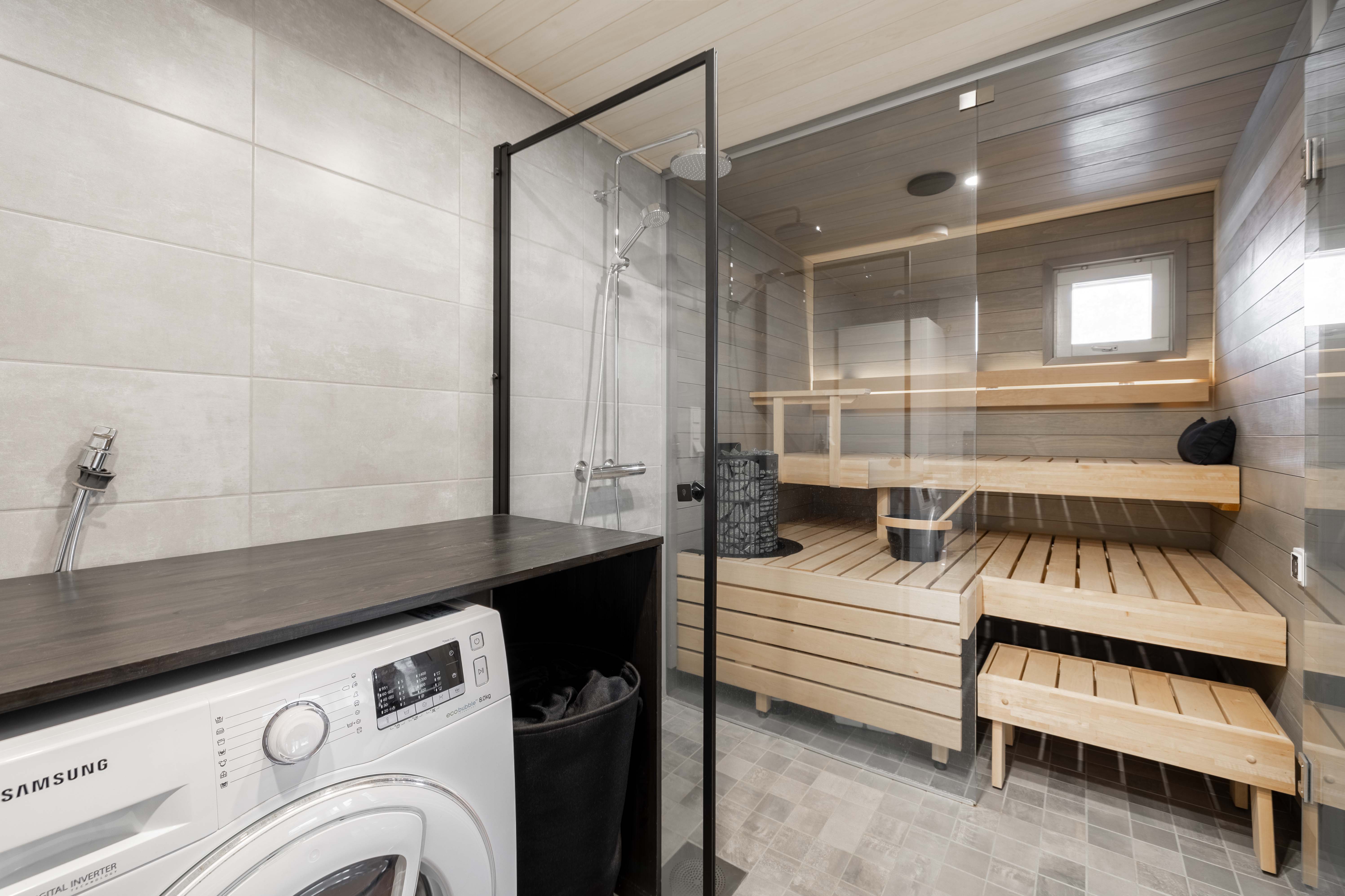 Upea saunaosasto tarjoaa täydelliset puitteet rentoutumiseen pitkän päivän päätteeksi ja arjen mukavuutta tuo lisäksi erillinen wc.