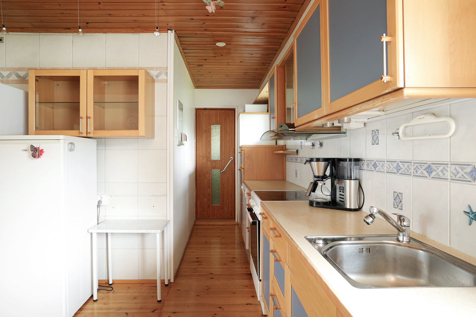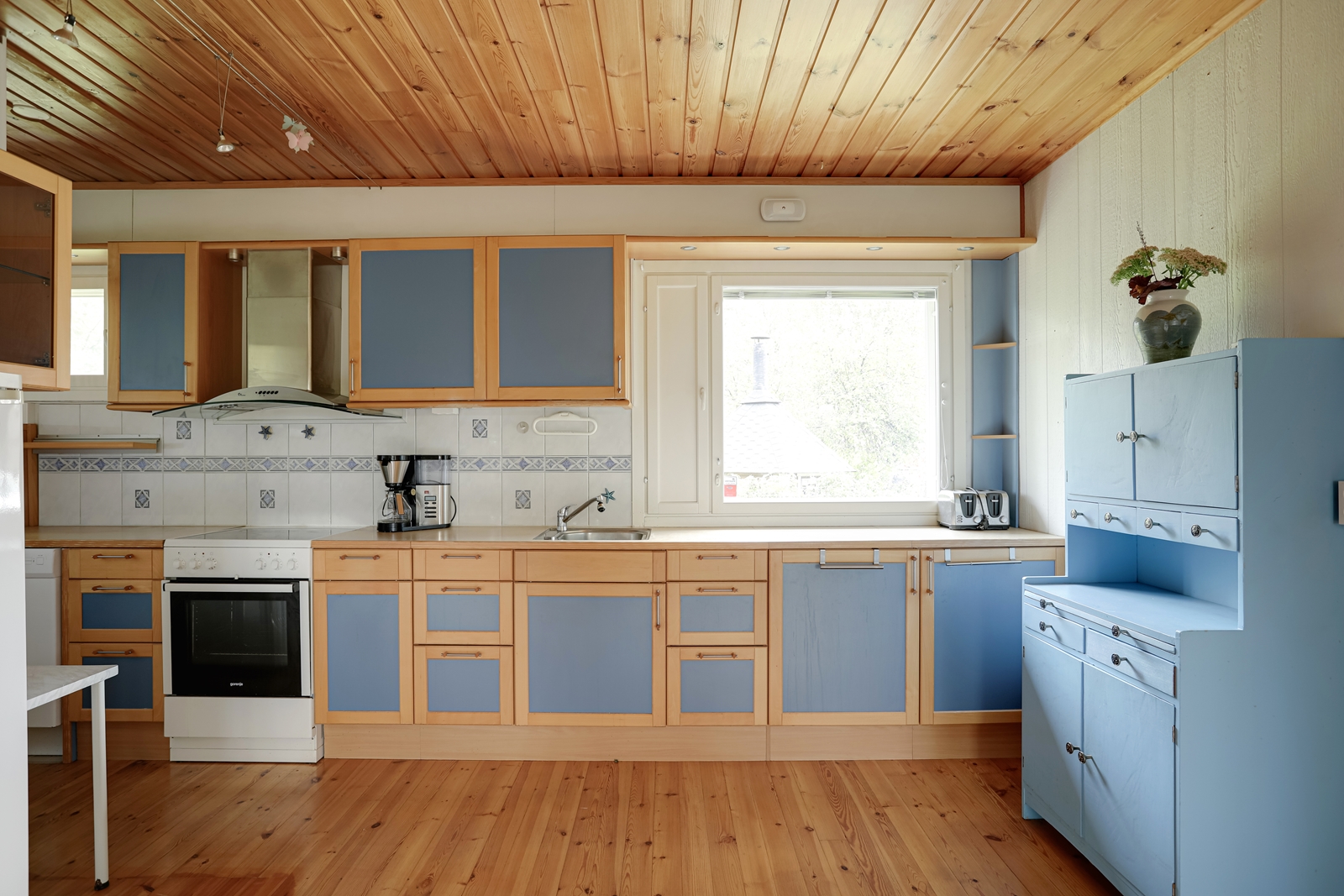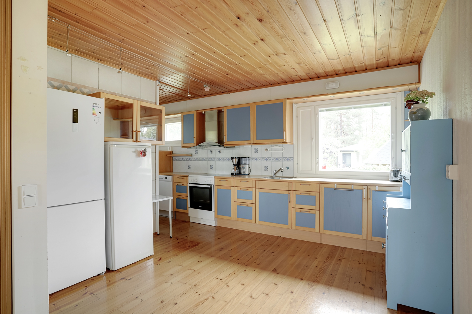 | Keittiön kuvaus | Liesi (Keraaminen liesi), seinät (kaakeli ja maali), lattiat (parketti), astianpesukone, liesi, liesituuletin, erillinen pakastin ja jääkaappipakastin |