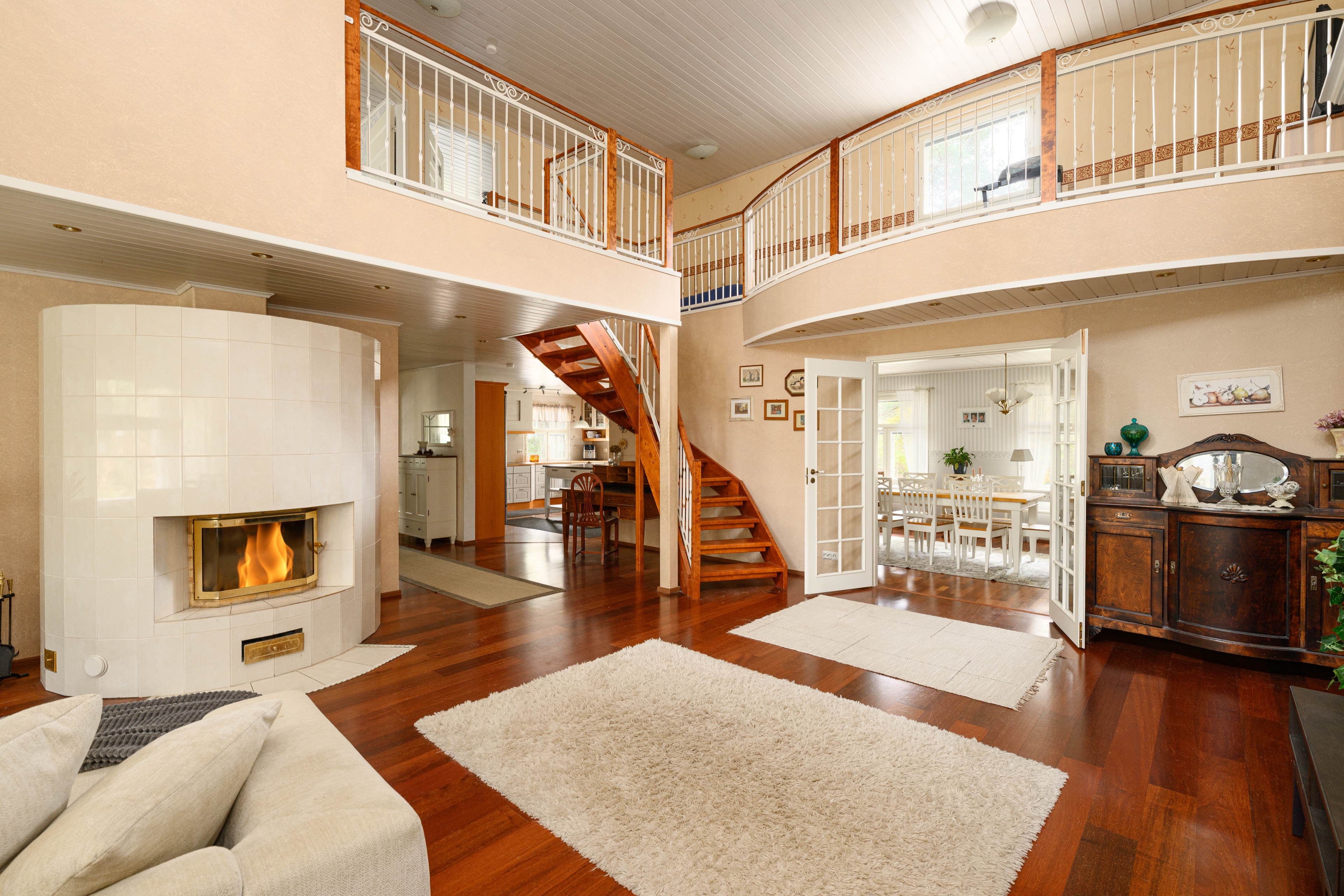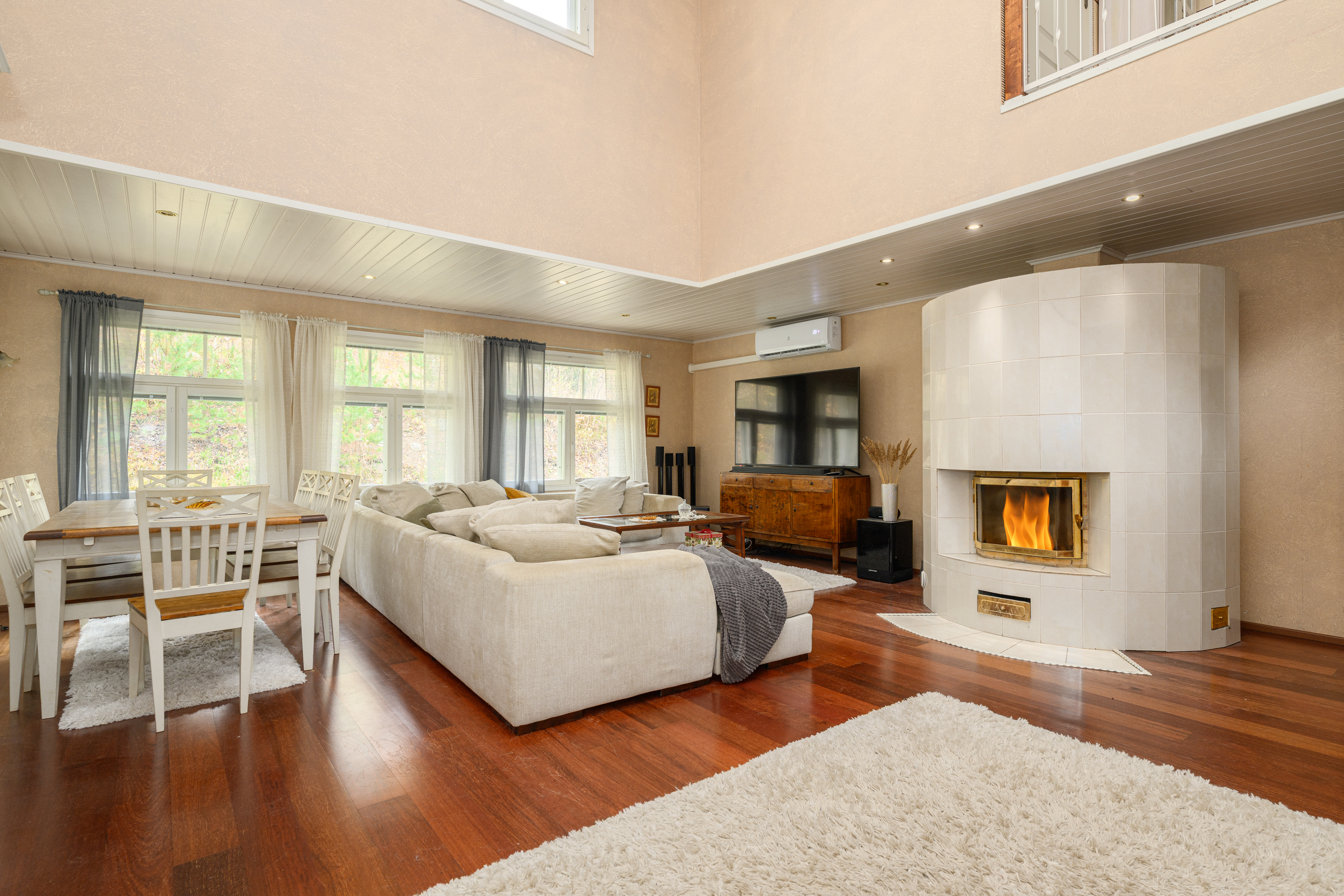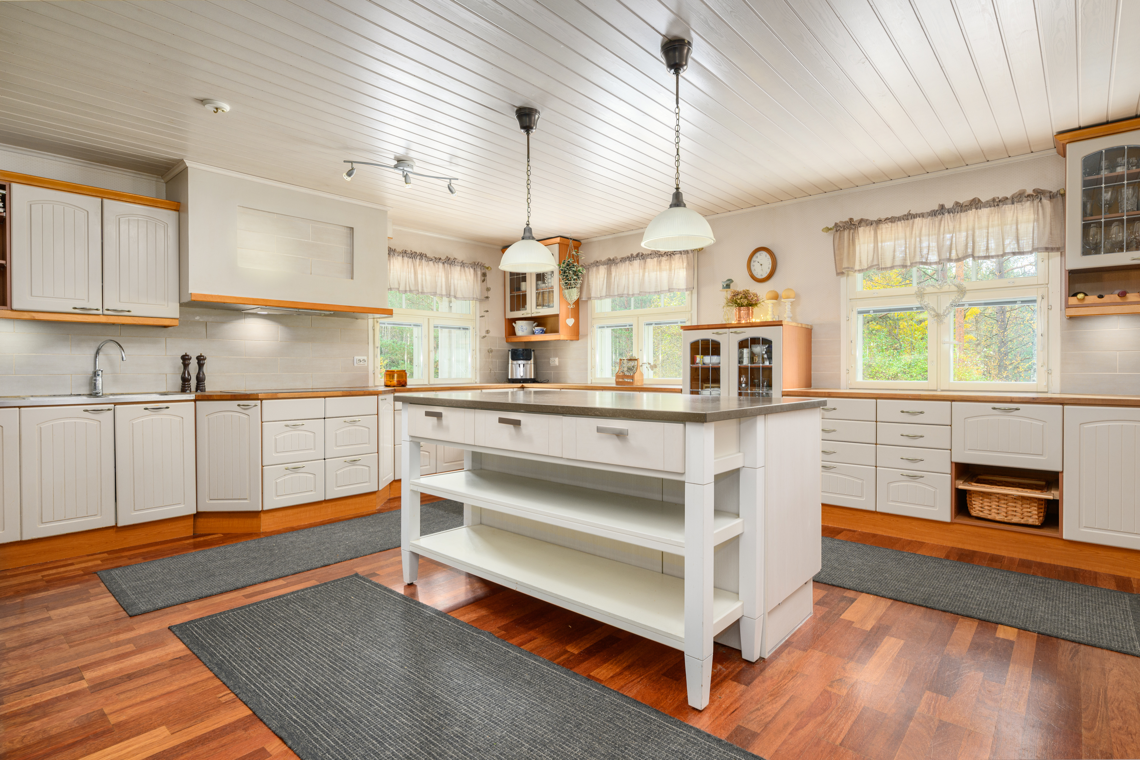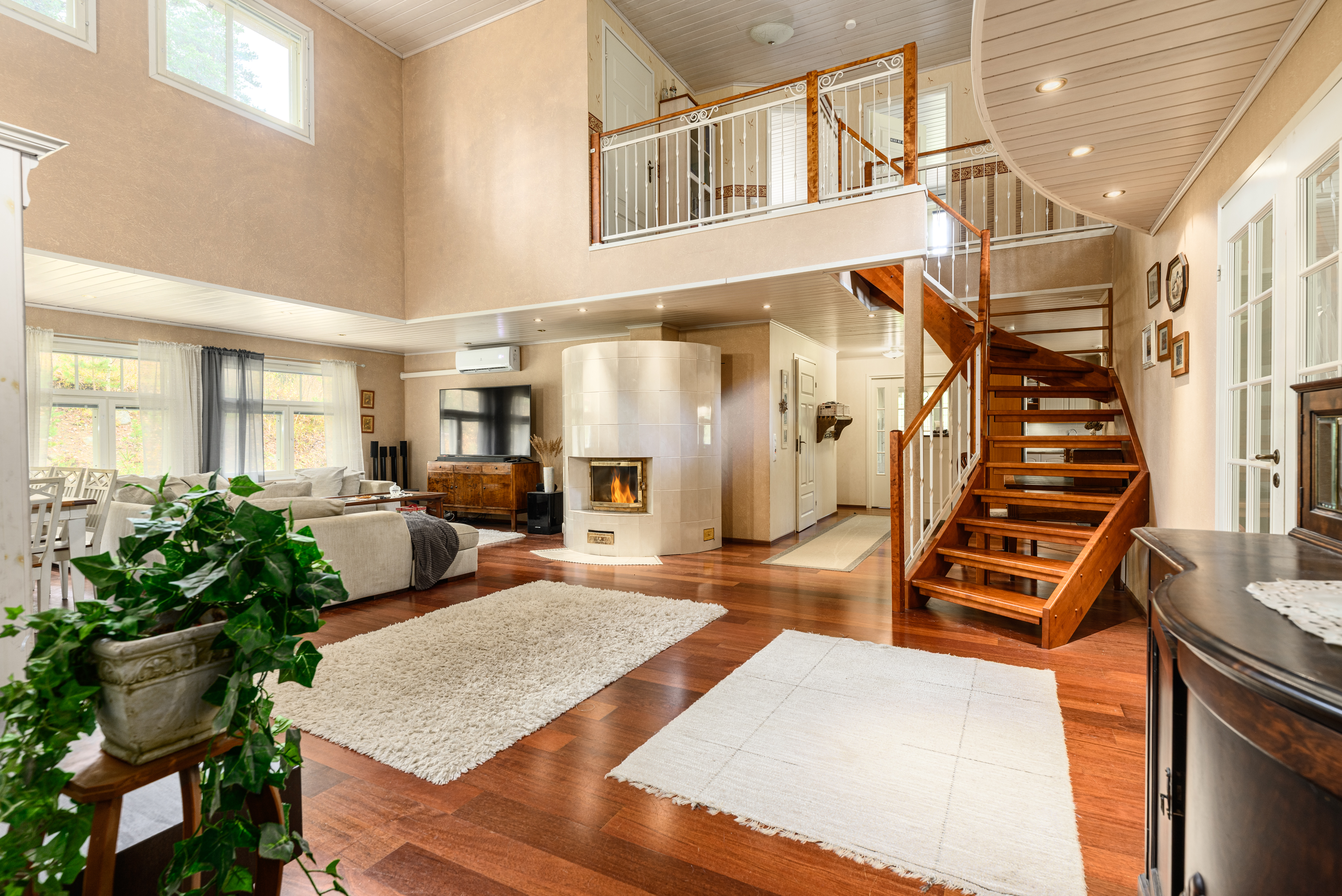 Keittiö on suunniteltu kestämään aikaa ja palvelemaan isonkin perheen tarpeita. Mittatilaustyönä tehdyt kaapit ja saareke ovat edelleen vertaansa vailla. Olohuoneen design-varaava takka tuo kodikkuutta ja lämpöä talvi-iltoihin. Kolme wc:tä, joissa kahdessa suihkumahdollisuus, takaavat arjen sujuvuuden.