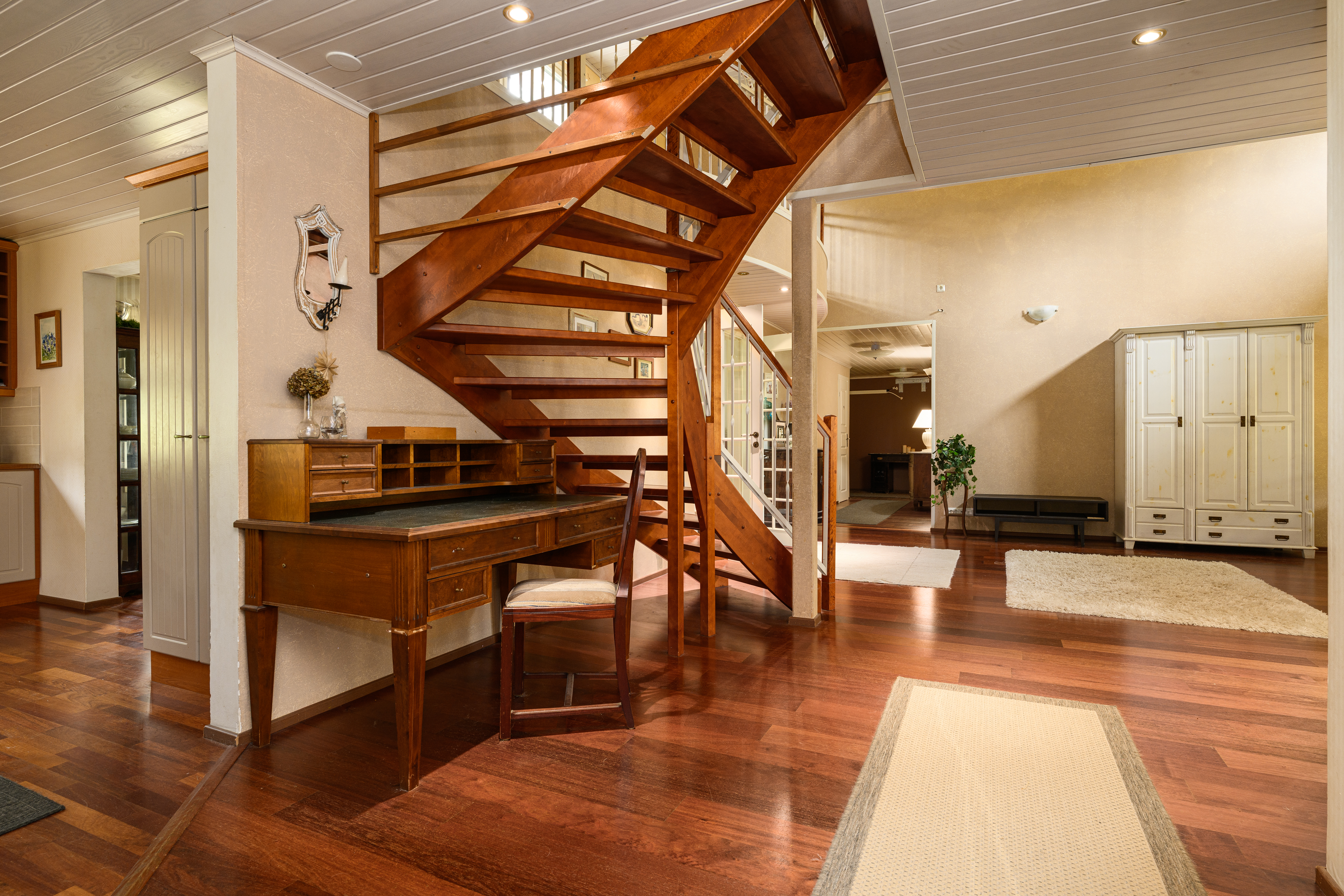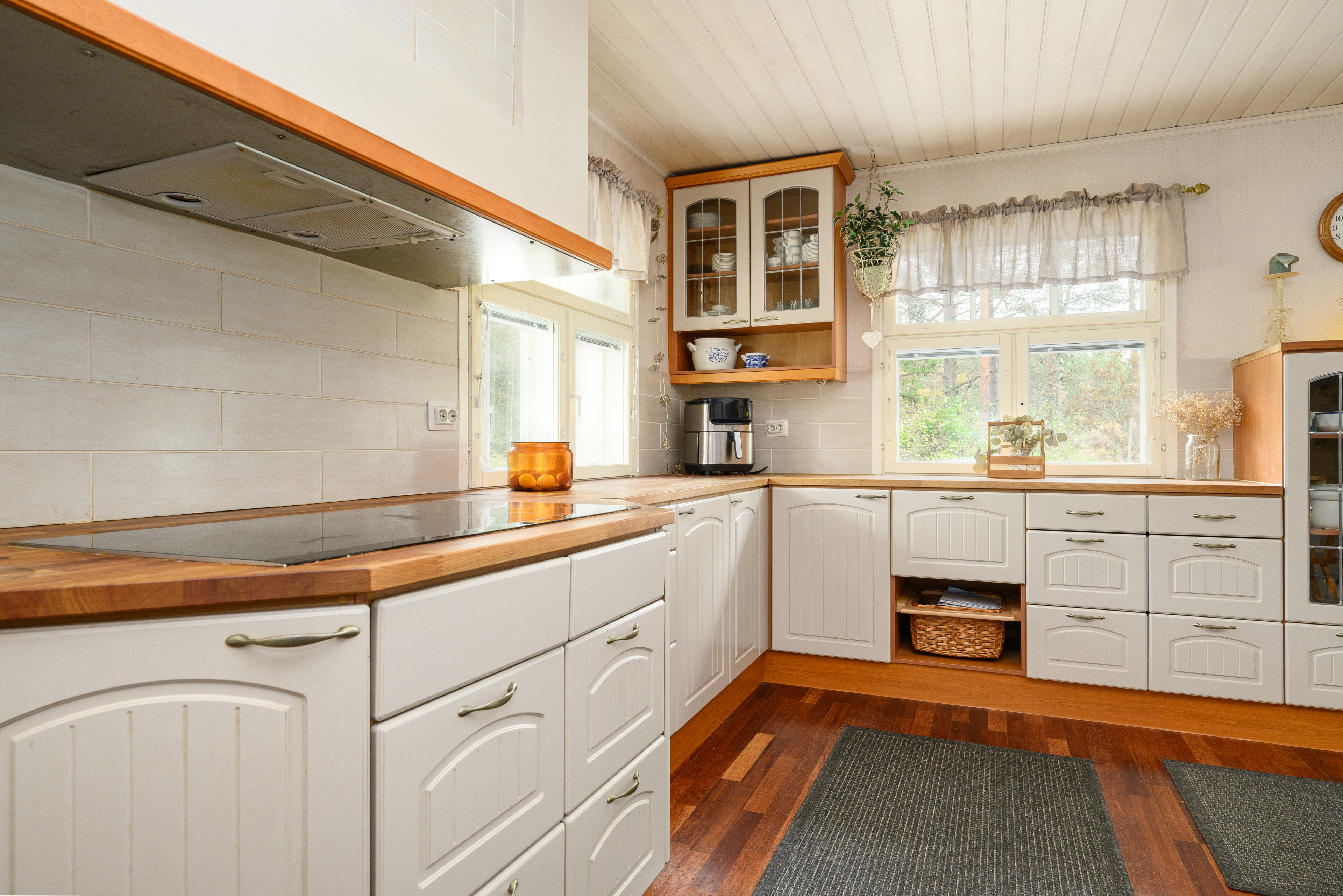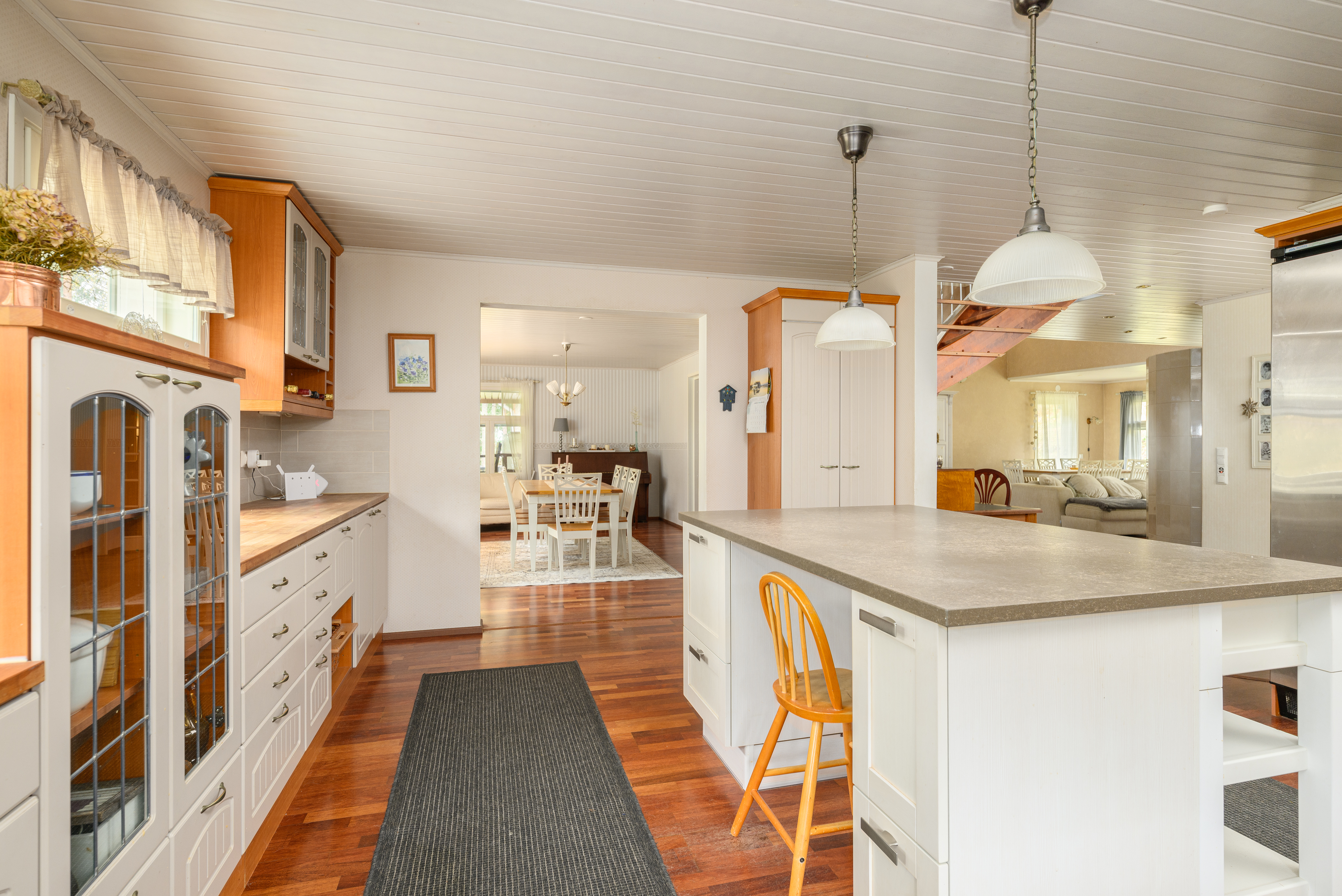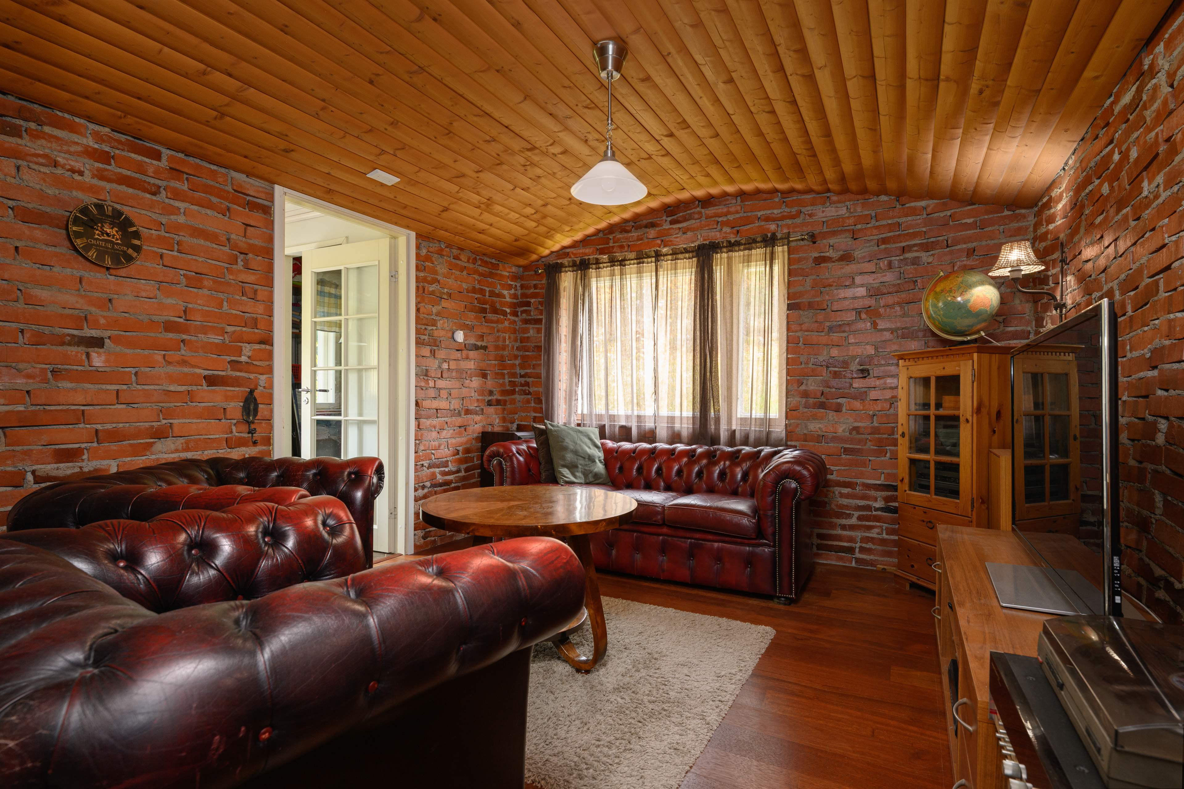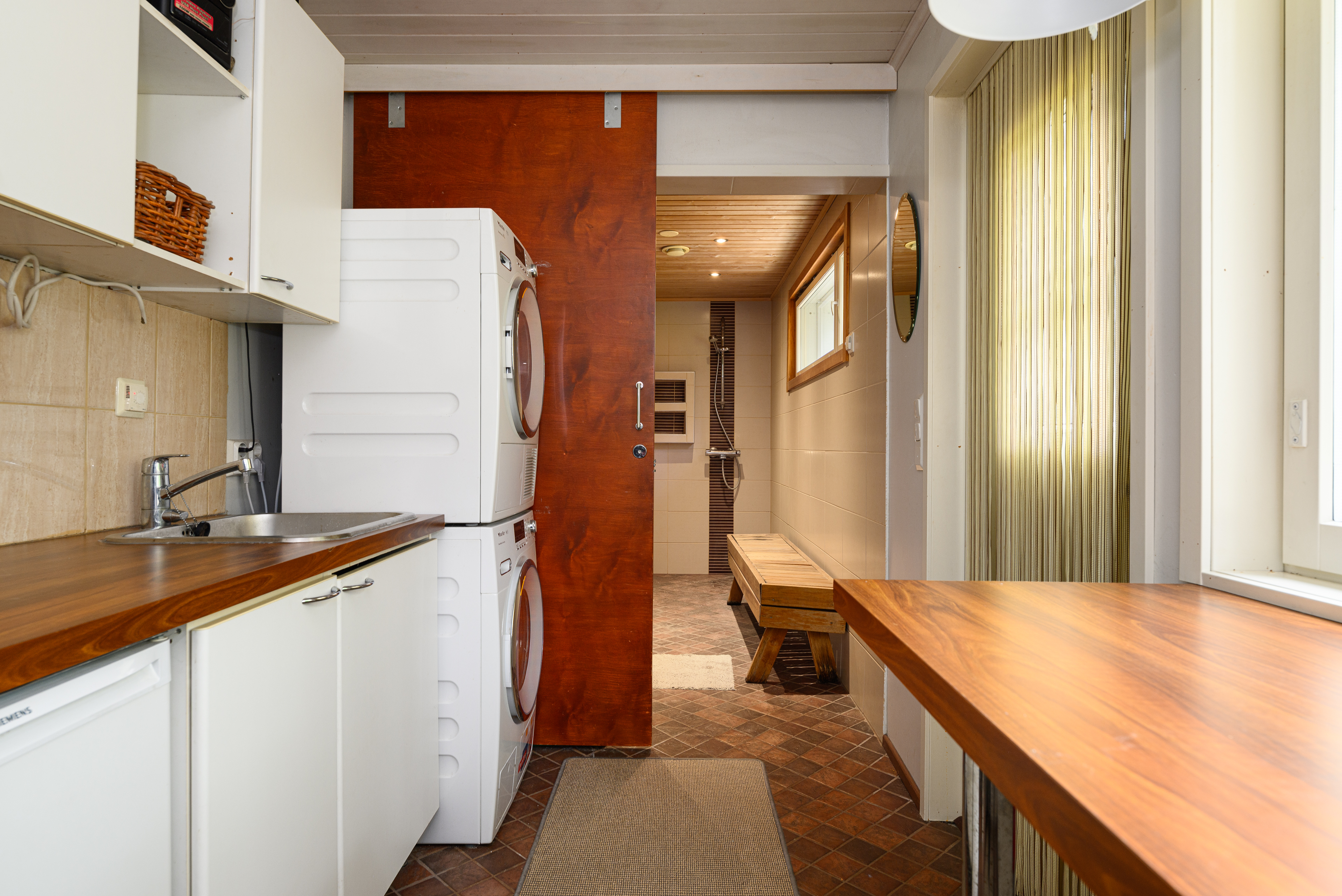 Keittiö on suunniteltu kestämään aikaa ja palvelemaan isonkin perheen tarpeita. Mittatilaustyönä tehdyt kaapit ja saareke ovat edelleen vertaansa vailla. Olohuoneen design-varaava takka tuo kodikkuutta ja lämpöä talvi-iltoihin. Kolme wc:tä, joissa kahdessa suihkumahdollisuus, takaavat arjen sujuvuuden.
