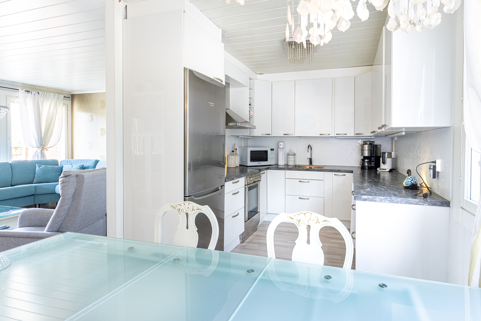 | Keittiön kuvaus | Liesi (Keraaminen liesi), työtasot (laminaatti), seinät (tapetti ja maali), lattiat (laminaatti), astianpesukone, jääkaappipakastin ja liesituuletin / hormi |