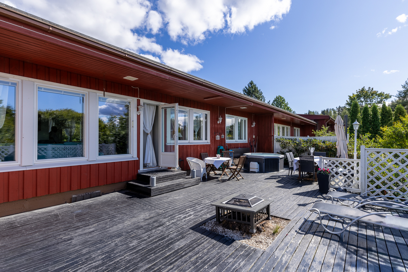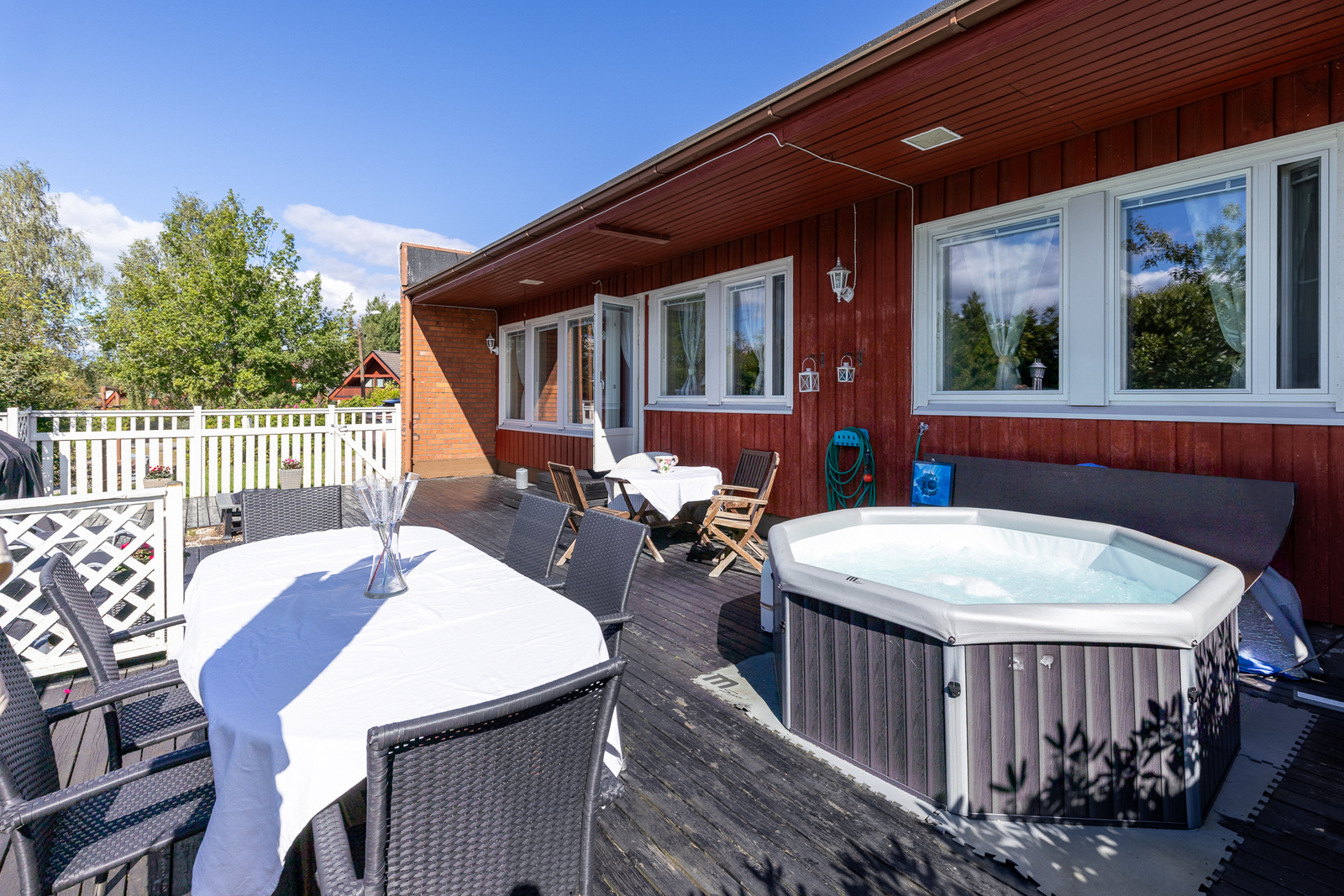 Rentoudu omalla terassilla: Olohuoneesta aukeaa käynti suojaisalle terassille, josta pilkistää Hiidenveden rauhoittava järvinäkymä. Täydellinen paikka nauttia aamukahvi tai rentoutua saunan jälkeen. Terassilla on myös ulkoporeamme rentouttavia kylpyjä varten.