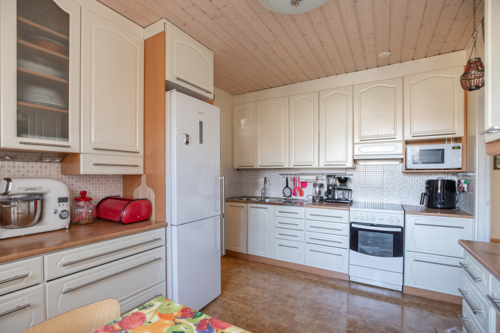 | Keittiön kuvaus | Liesi (Keraaminen liesi), seinät (maali), lattiat (muovimatto), jääkaappipakastin ja liesituuletin |
