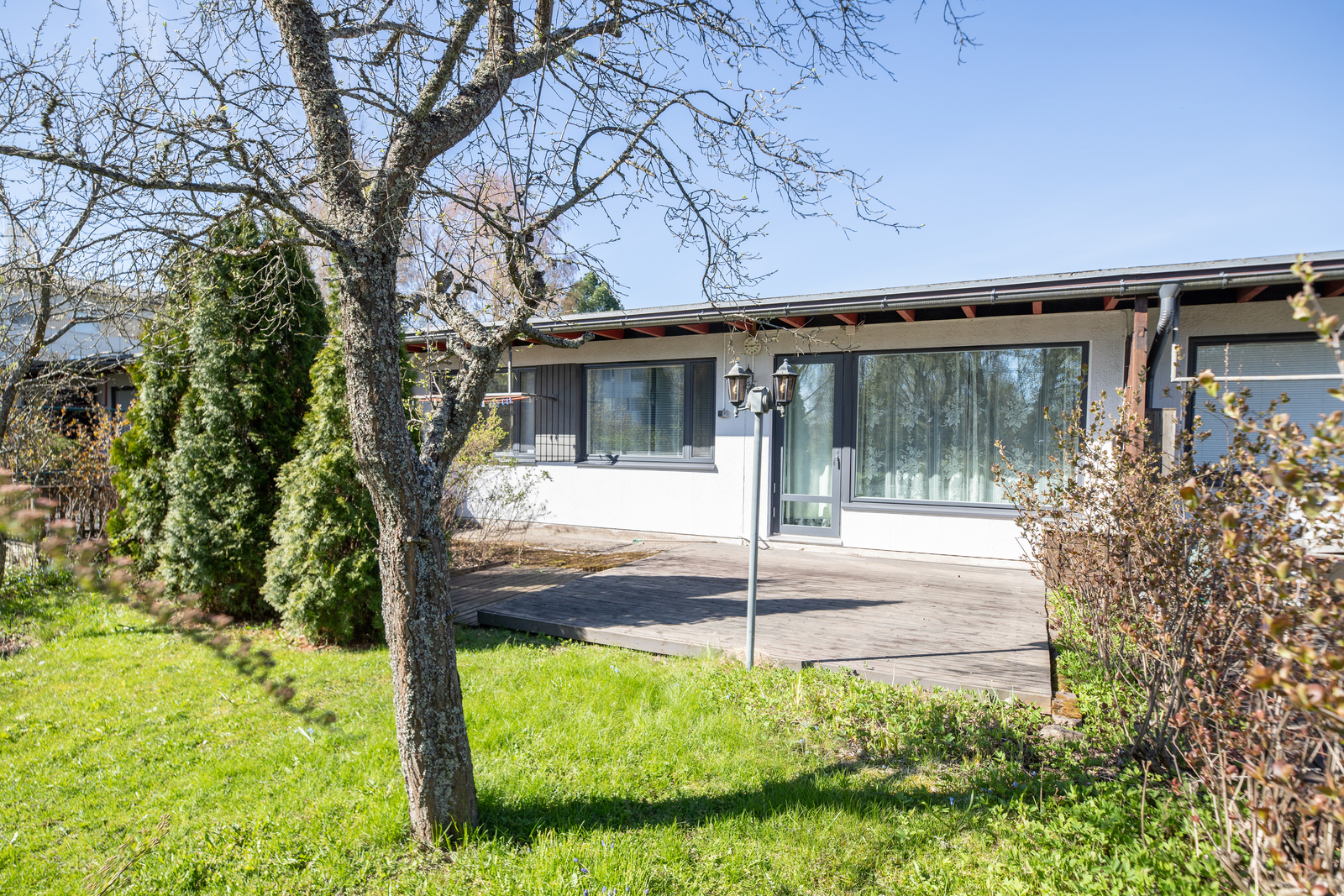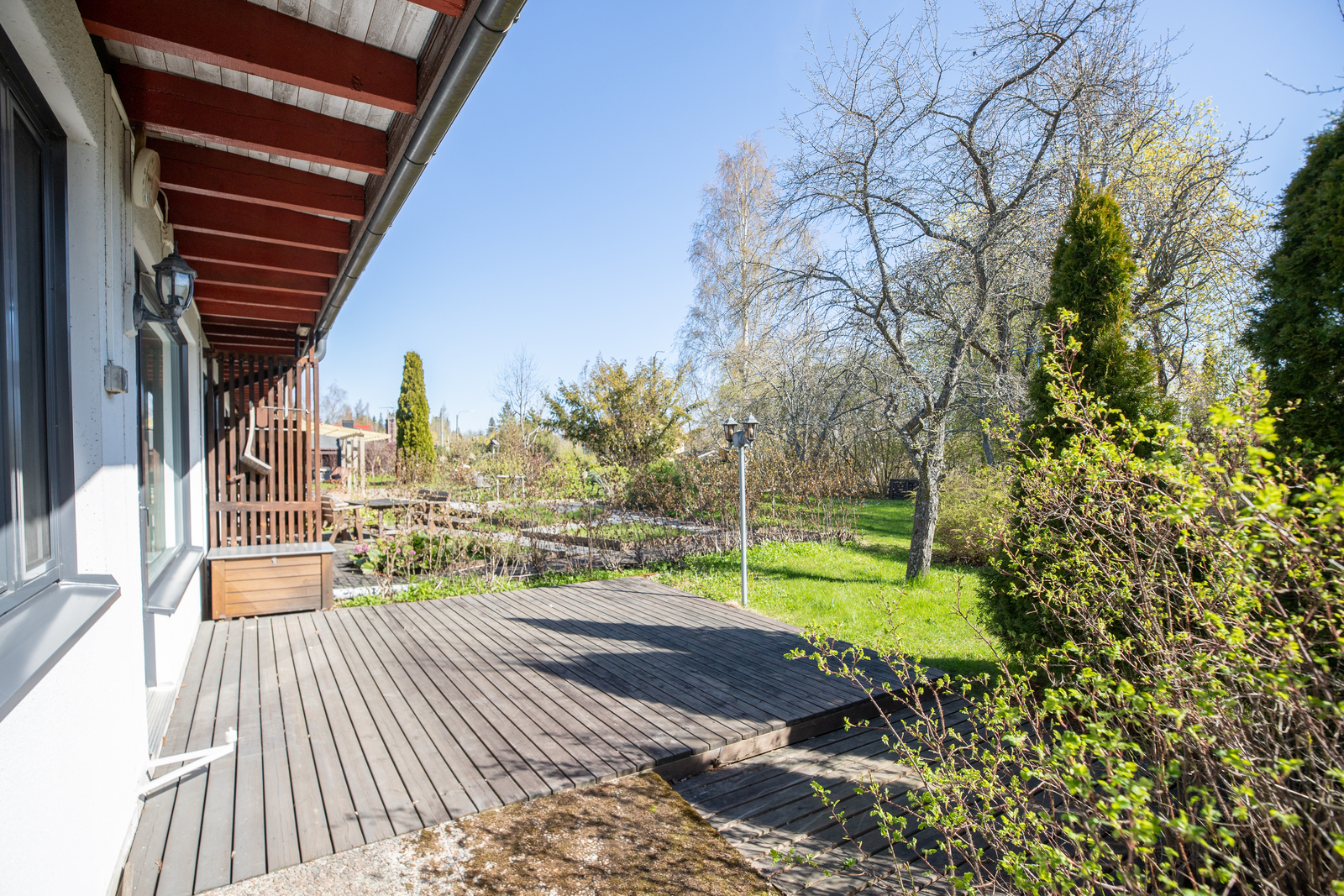 Tilava takapiha on suojaisa ja viihtyisän vehreä. Etupihallakin on iso patio oleskeluun.