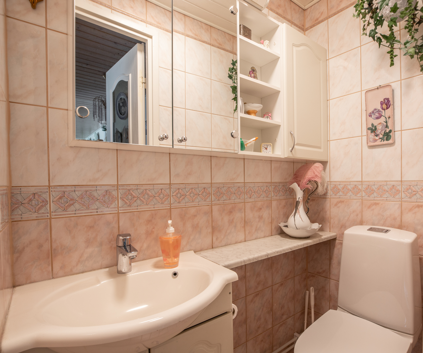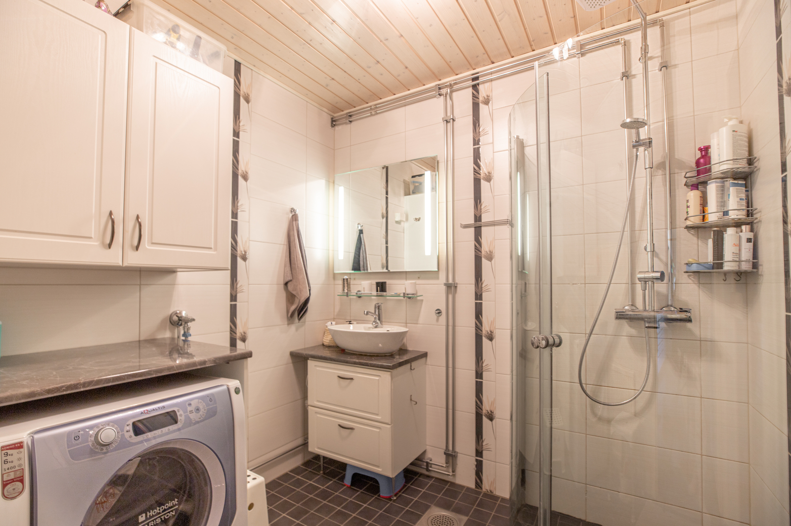 | Kylpyhuoneen kuvaus | Suihkuseinä, pesukoneliitäntä, suihku, allaskaappi ja peili, seinät (kaakeli), lattiat (laatta) |