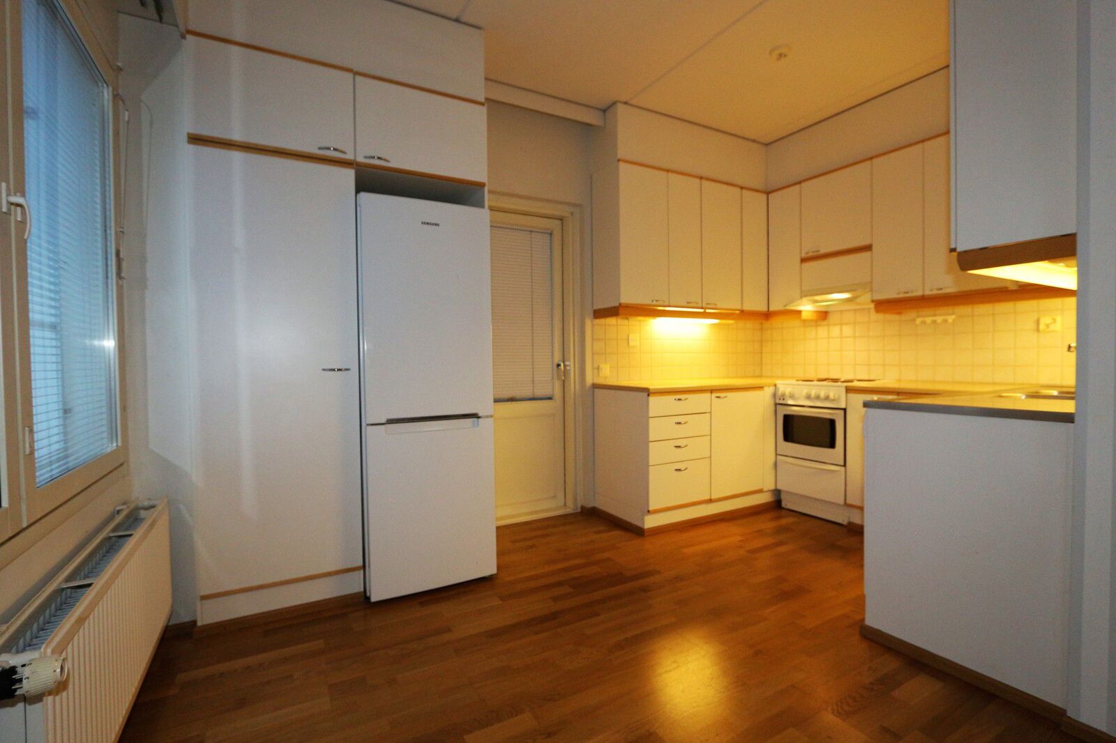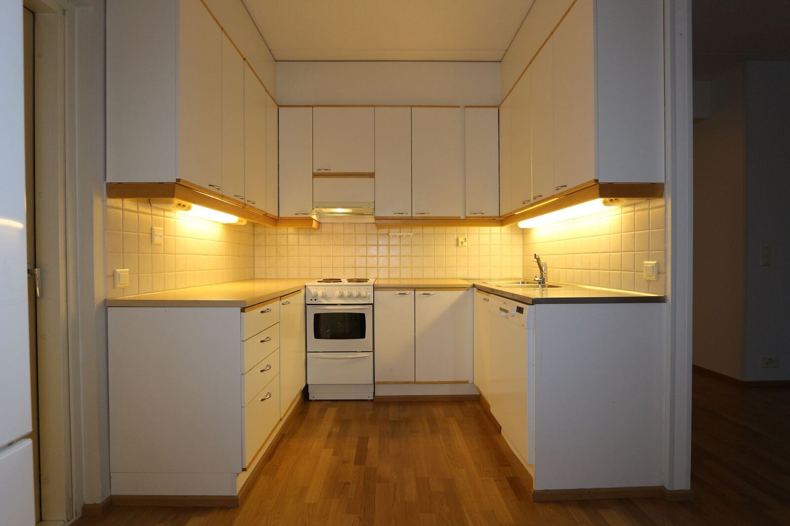Keittiön kuvaus Liesi (Keraaminen liesi), työtasot (laminaatti), seinät (maali), lattiat (parketti), liesituuletin, jääkaappi, astianpesukone ja kiinteät valaisimet
