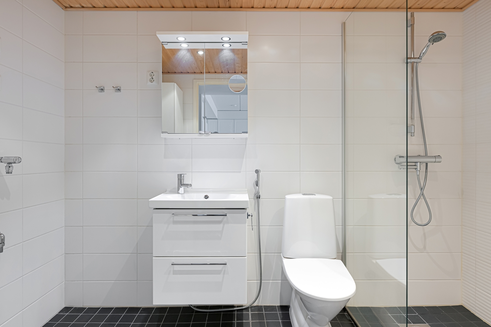 Suihkuseinä, pesukoneliitäntä, wc-istuin, peilikaappi, suihku, allaskaappi ja lattialämmitys, seinät (kaakeli), lattiat (laatta) |
