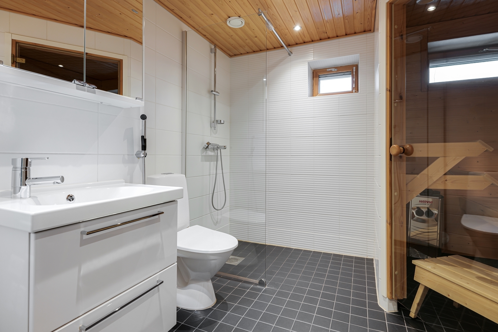 Lattialämmitys, peilikaappi, suihkuseinä, wc-istuin, allaskaappi ja pesukoneliitäntä, seinät (kaakeli), lattiat (laatta) |