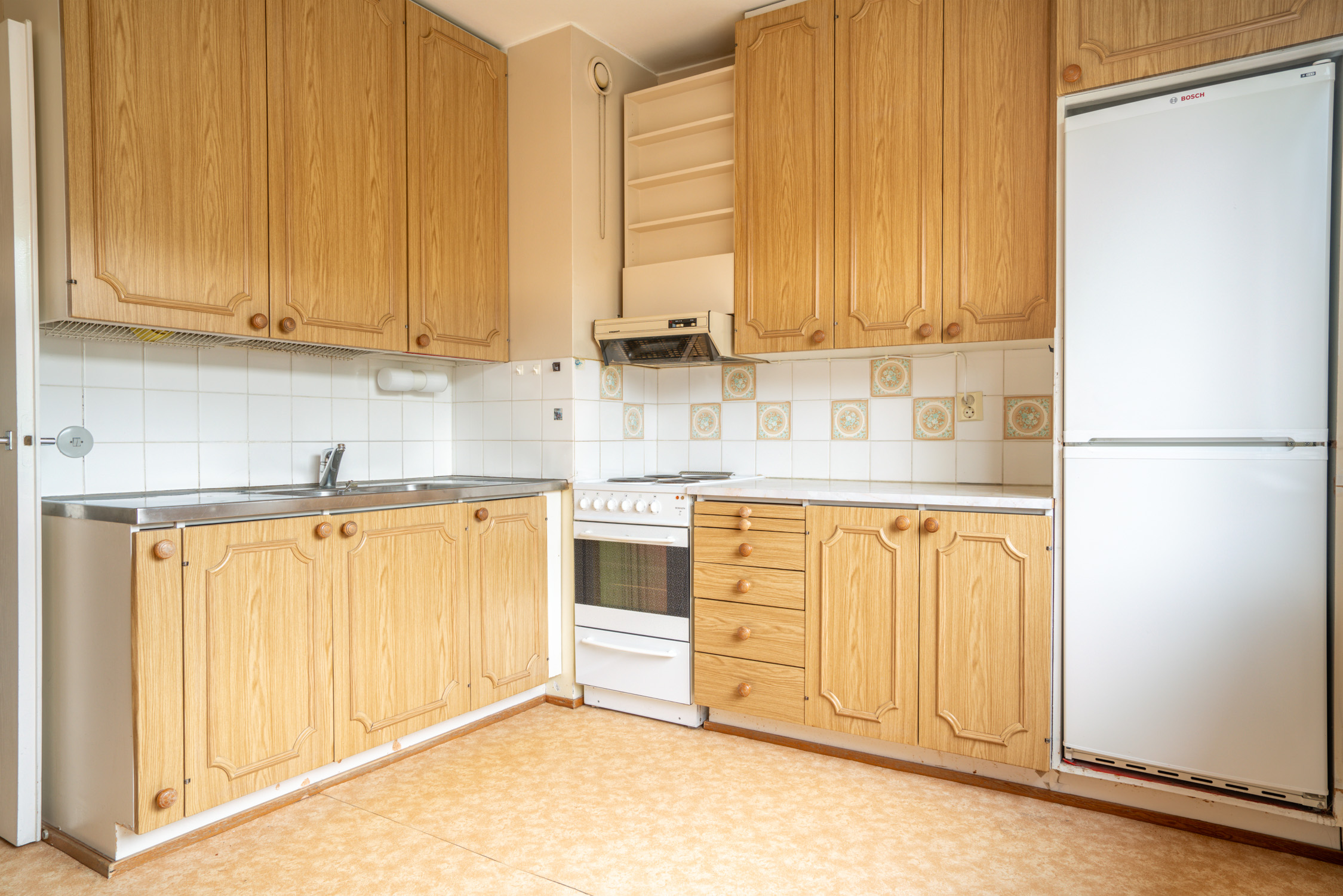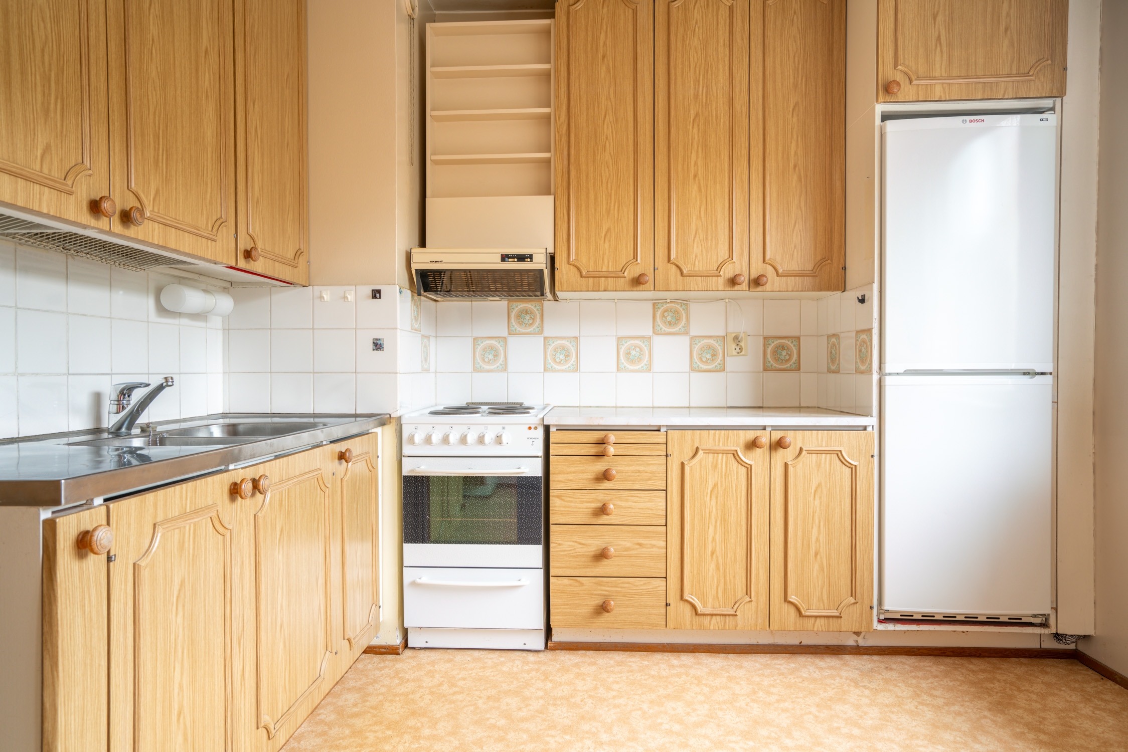 Liesi (Valurautaliesi), työtasot (laminaatti), seinät (maali), lattiat (muovimatto), jääkaappipakastin, liesi ja liesituuletin |
