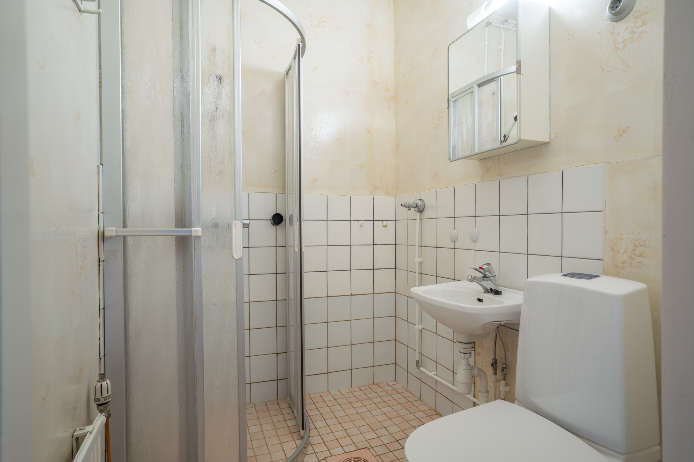 WC-istuin, pesukoneliitäntä, suihkukaappi, suihku, peilikaappi ja pesuallas, seinät (kaakeli ja muovimatto), lattiat (laatta) |