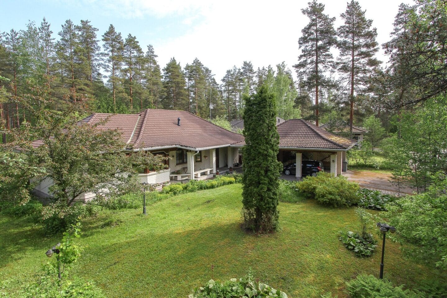 Metsän laidalla, luonnon ja lenkkipolkujen läheisyydessä. Talo, jossa on helppo hengittää ja jossa ei ole teräviä ulkokulmia. Kaunis tiiliverhoiltu koti, jossa neljä mukavan kokoista makuuhuonetta. Todella tilavassa ja avarassa olohuoneessa on korkea huonekorkeus ja käsin rakennettu kaunis puukatto. Olohuoneen yhteydessä reilun kokoinen tv-nurkkaus ja ruokailutila, jonka vieressä keittiö saarekkeella. Kodista löytyy myös pieni uima-allas avoimen takkahuone yhteydessä. Takkahuoneen vieressä pukuhuone, kodinhoitohuone ja kylpyhuone, jossa poreamme. Kodinhoitohuoneesta kulkuyhteys ulos. Talon sauna on puusauna. Talon sisällä olevien säilytyskaapistojen ja vaatehuoneen lisäksi, autokatoksen yhteydessä on myös kaksi varastotilaa, joista toisen alla pieni kellaritila. Talo on rakennettu ihanan isolle tontille, jossa isot nurmikkoalueet ja paljon istutuksia. Pihaa on mahdollisuus laajentaa vielä isommaksi, tontin jatkeena olevan kulmatontin ostomahdollisuudella. Tämä koti on nähtävä itse, kuvat eivät pysty kertomaan kodista kaikkea, eivätkä tee tälle tilavalla ja uniikille kodille oikeutta.
