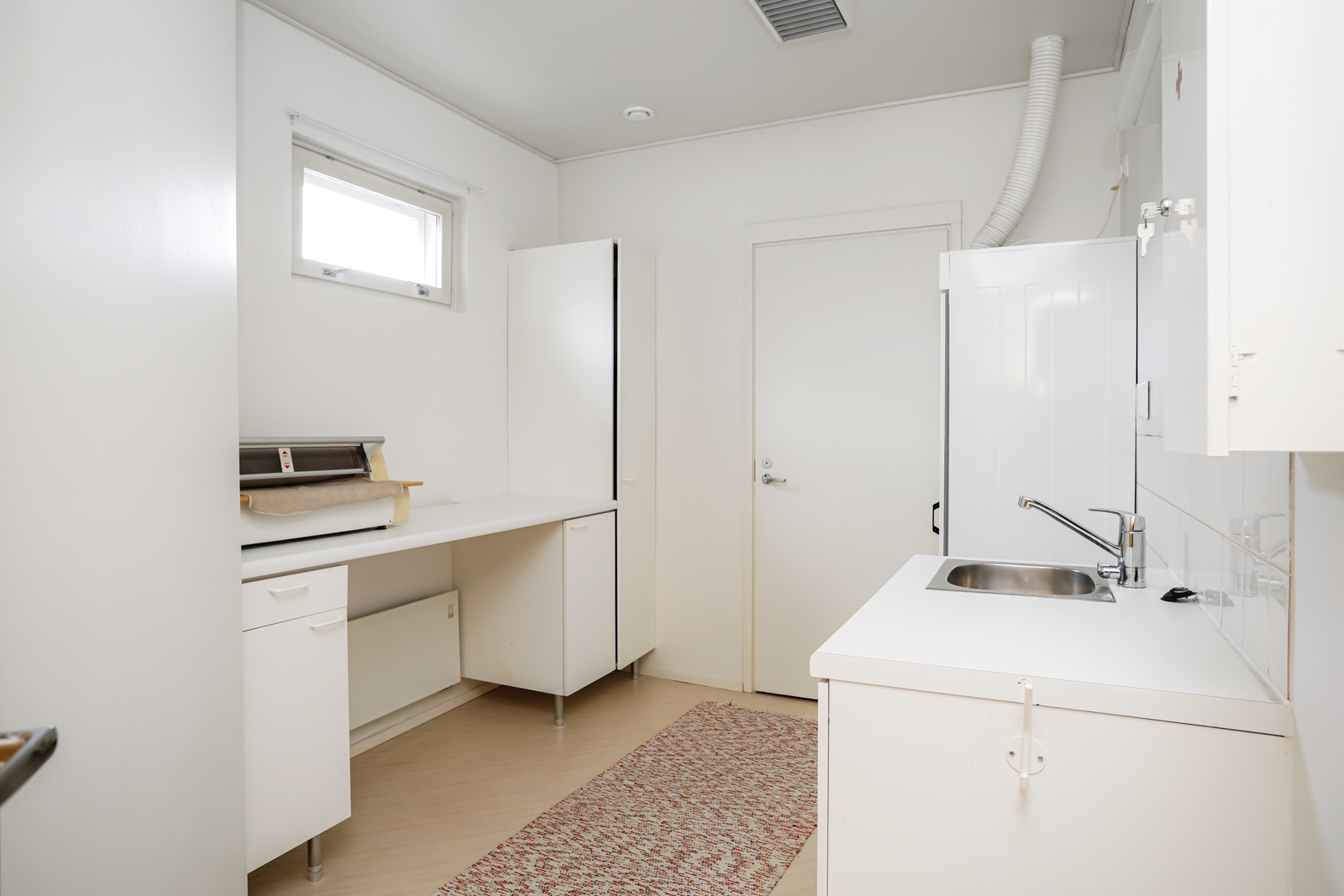 | Kodinhoitohuoneen kuvaus | Lattiakaivo, pesukoneliitäntä ja kuivauskaappi, lattiat (muovimatto), seinät (maali) |
