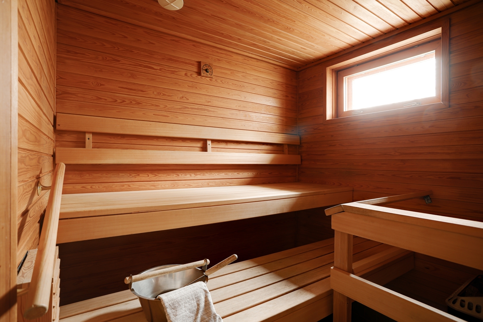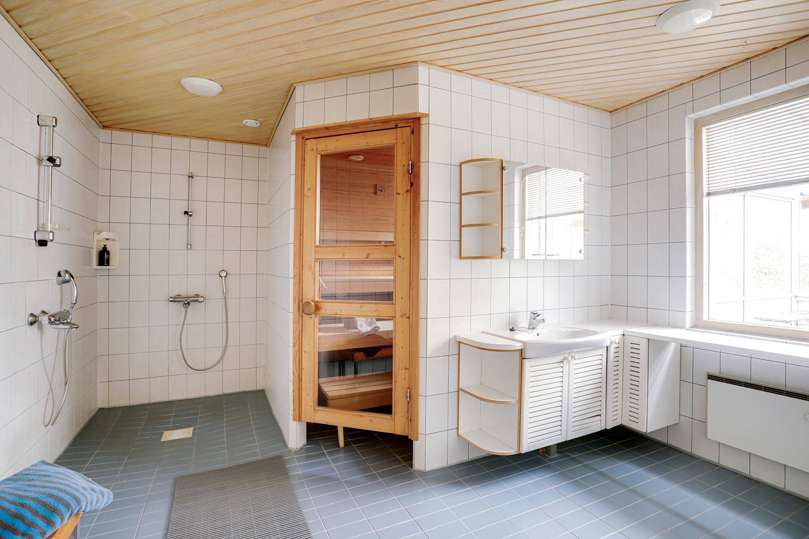 Tilava saunaosasto, josta kulku lasitetulle terassille aurinkoon.