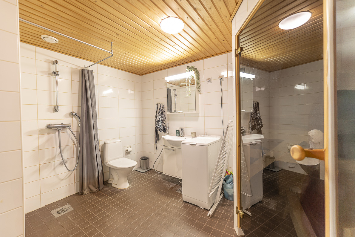 | Kylpyhuoneen kuvaus | Suihku, allaskaappi, lattialämmitys, wc-istuin, peilikaappi, pesukoneliitäntä ja kiinteät valaisimet, seinät (kaakeli), lattiat (laatta) |