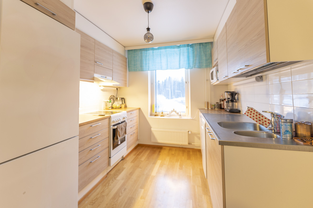 | Keittiön kuvaus | Liesi (Keraaminen liesi), työtasot (laminaatti ja metalli), seinät (maali), lattiat (parketti), jääkaappipakastin, astianpesukone ja liesituuletin / hormi, kiinteät valaisimet |