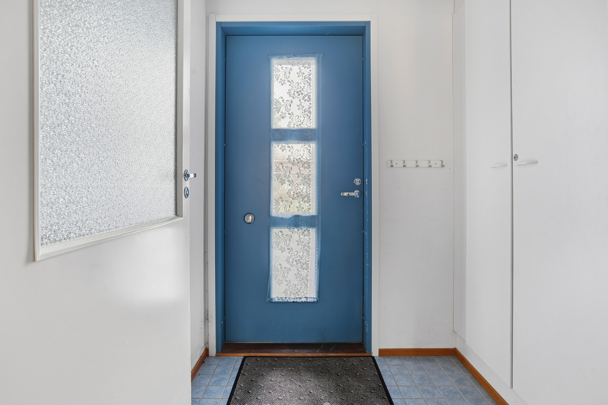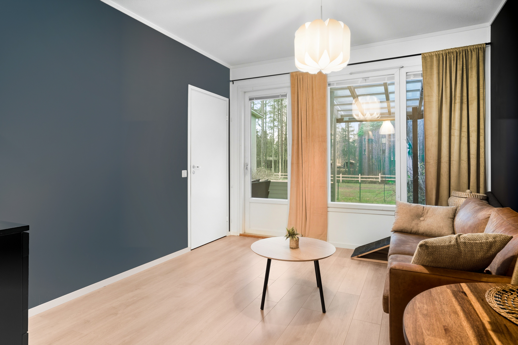 Seinät (tapetti ja maali), lattiat (laminaatti), Olohuoneesta käynti takapihan terassille. |