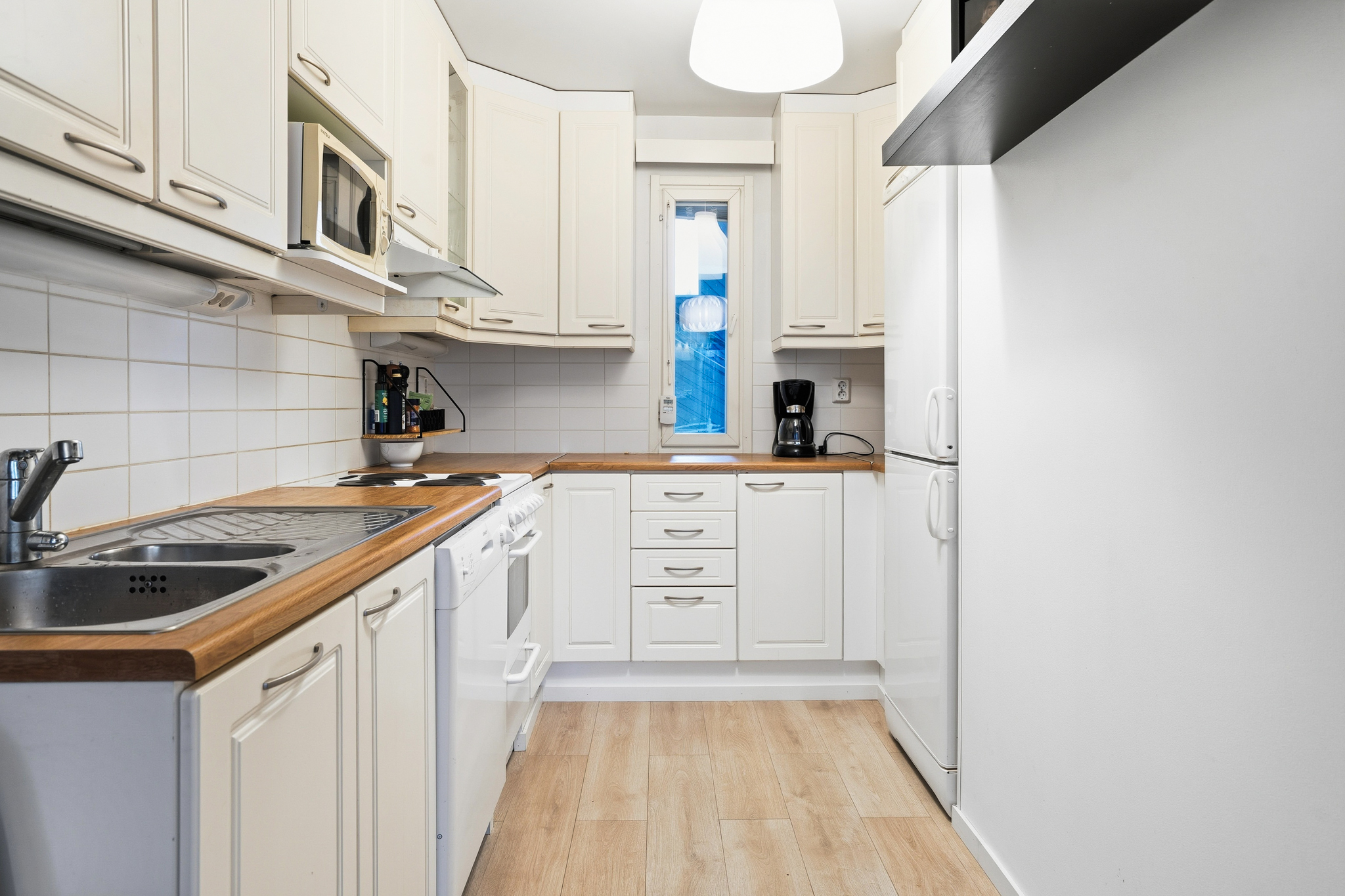Liesi (Keraaminen liesi), työtasot (laminaatti), seinät (maali), lattiat (laminaatti), jääkaappipakastin, uuni, astianpesukone ja liesituuletin |