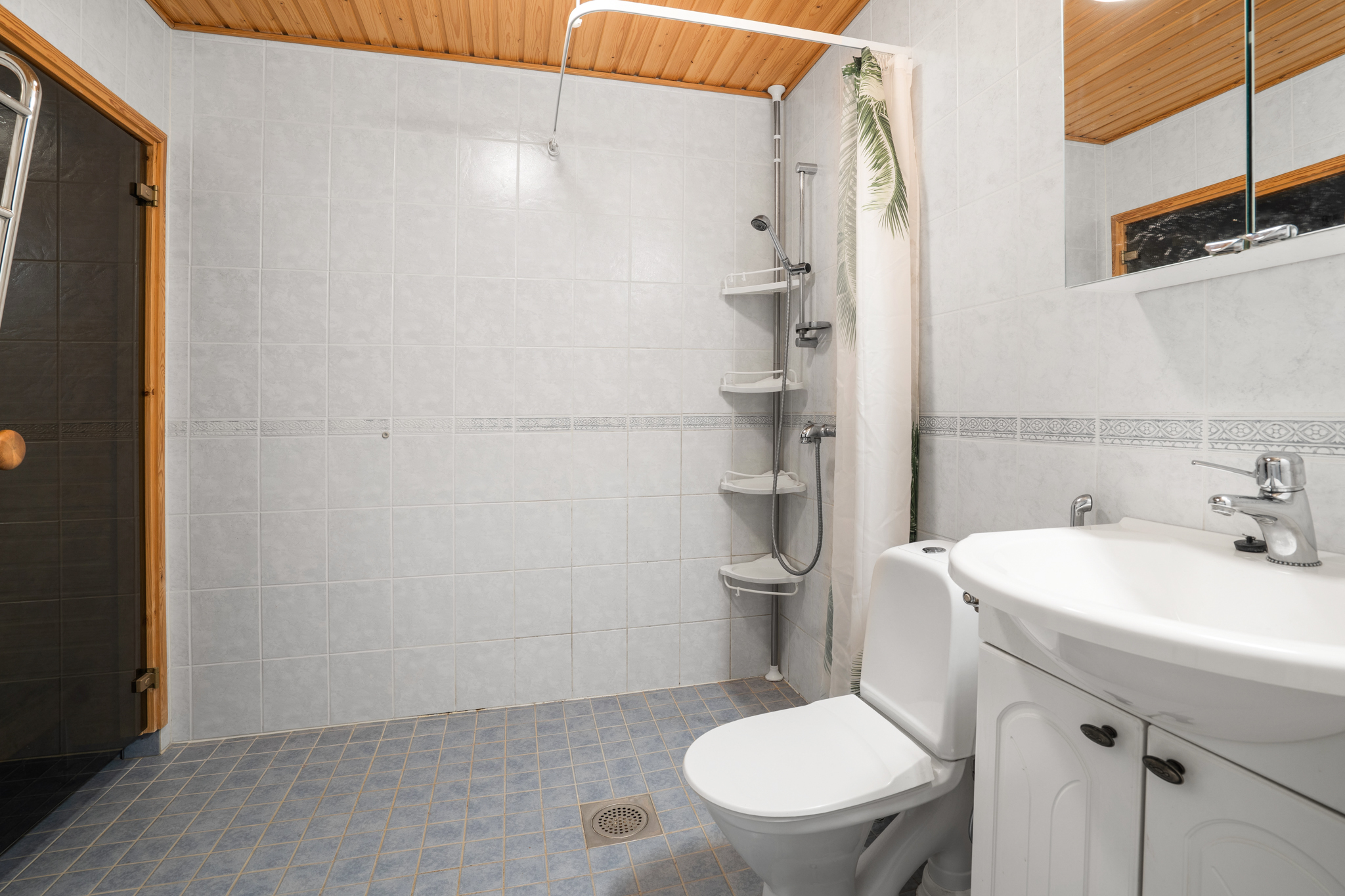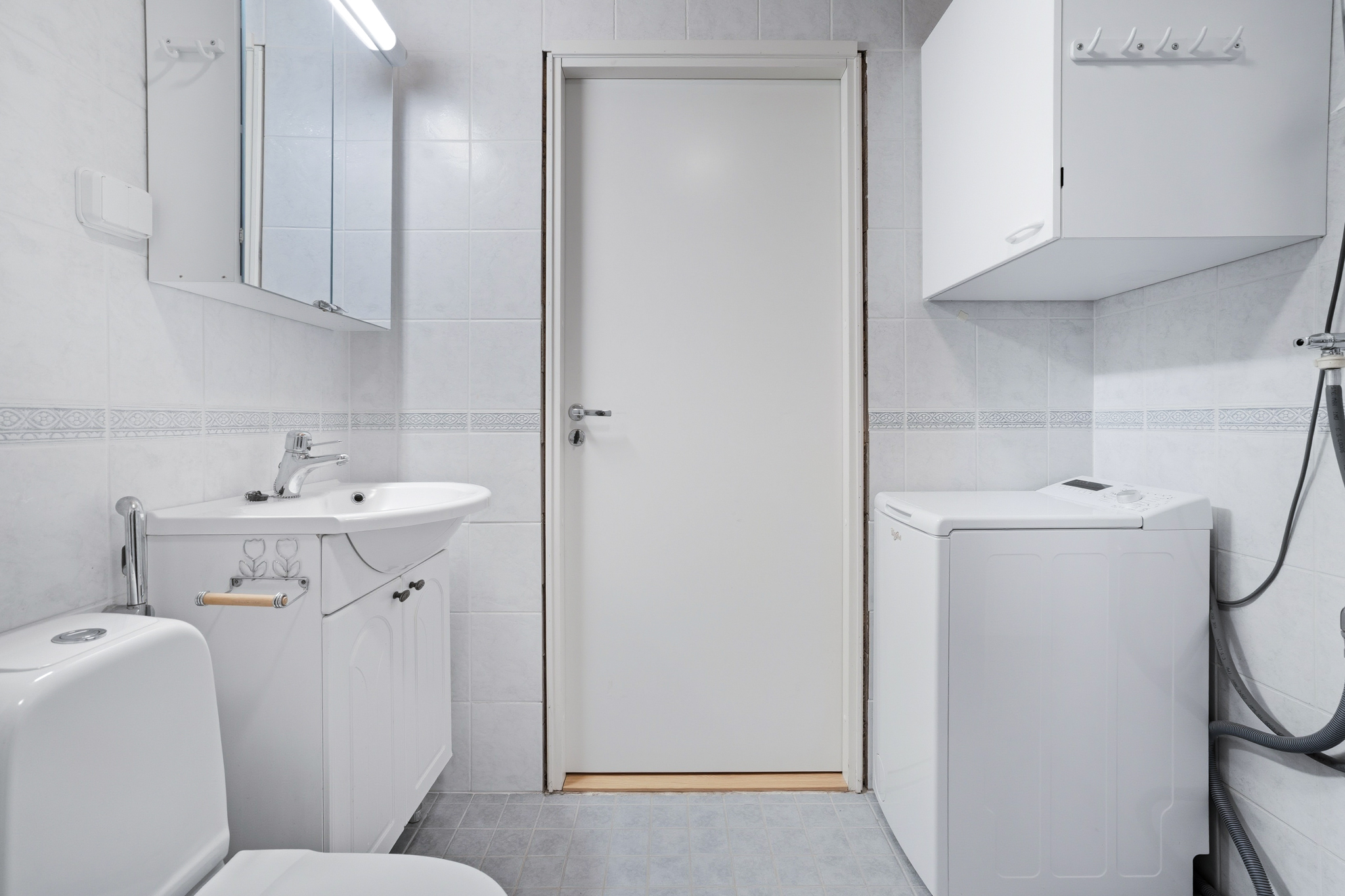 WC-istuin, suihku, pesukoneliitäntä, lattialämmitys, peilikaappi, pesuallas ja bidee-suihku, seinät (kaakeli), lattiat (laatta) |