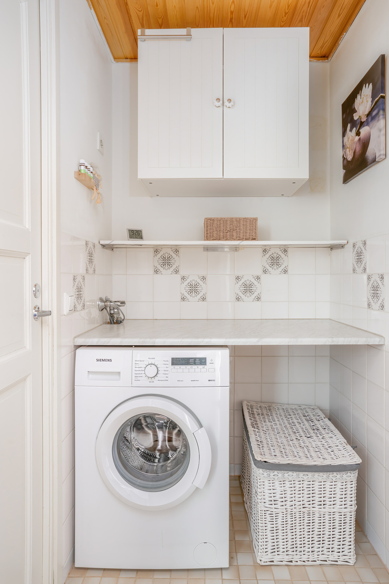 | Kodinhoitohuoneen kuvaus | Pöytätaso, lattialämmitys ja pesukoneliitäntä, lattiat (laatta), seinät (maali ja kaakeli), Khh:n seinät on osaksi laatoitettu ja osaksi maalattu (maalaus v. 2009). |