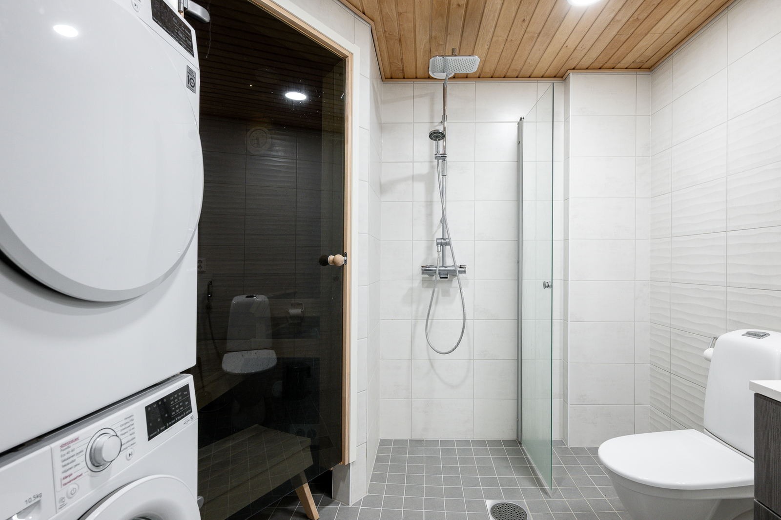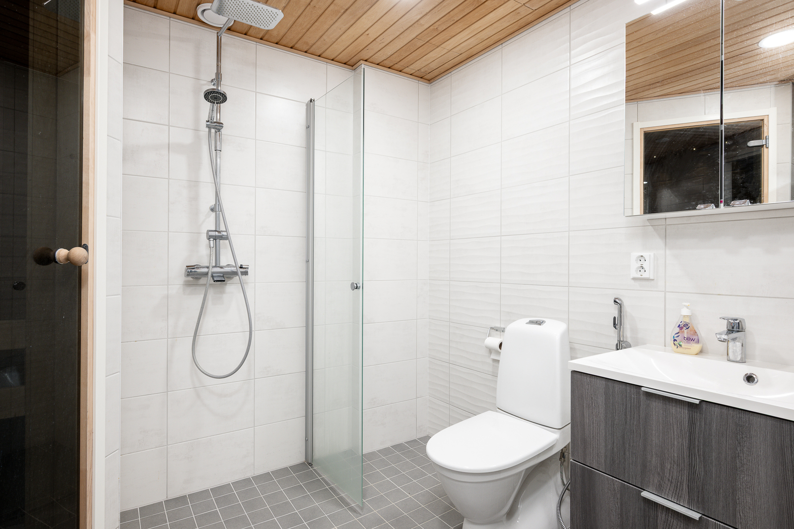 WC-istuin, suihkuseinä, lattialämmitys, peilikaappi, suihku ja kiinteät valaisimet, seinät (kaakeli), lattiat (laatta) |