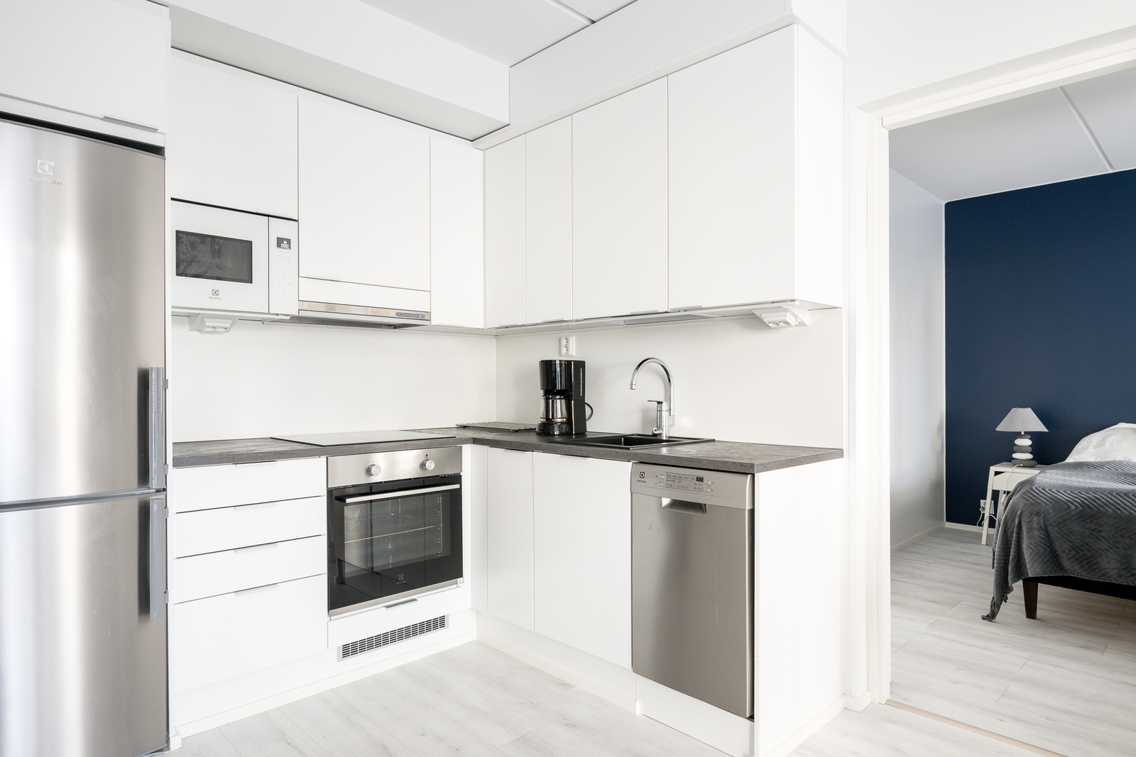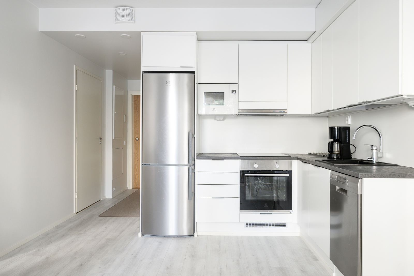 Liesi (Induktioliesi ja erillisuuni), työtasot (laminaatti), seinät (maali), lattiat (vinyyli), erillisuuni, jääkaappipakastin, liesi, mikroaaltouuni, astianpesukone ja liesituuletin / hormi |