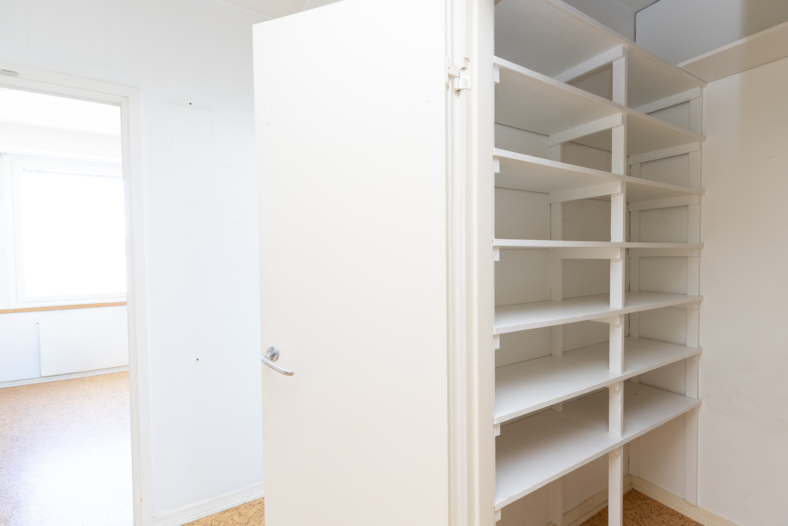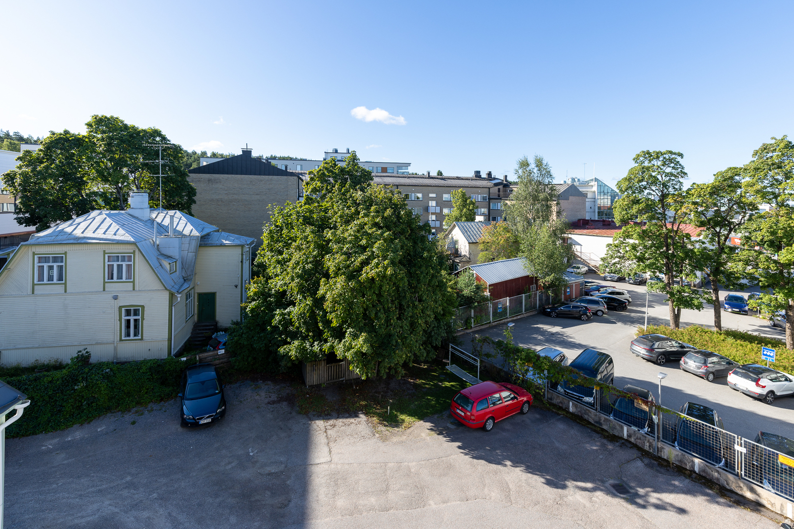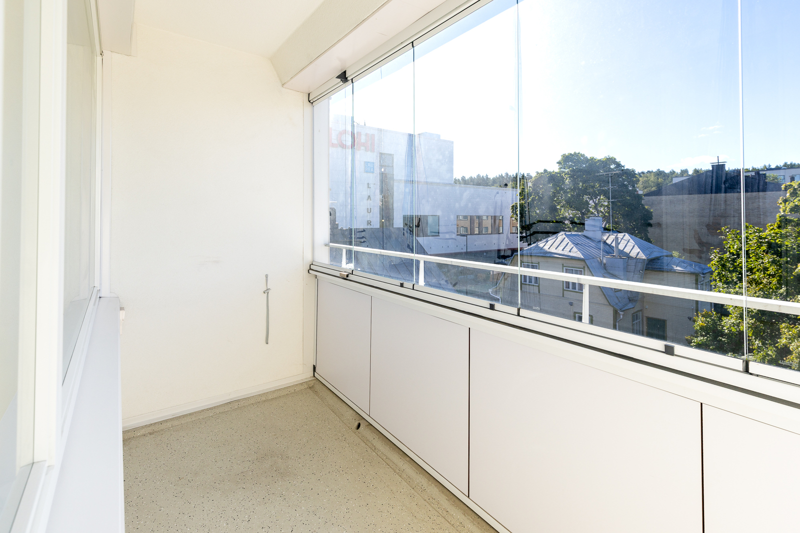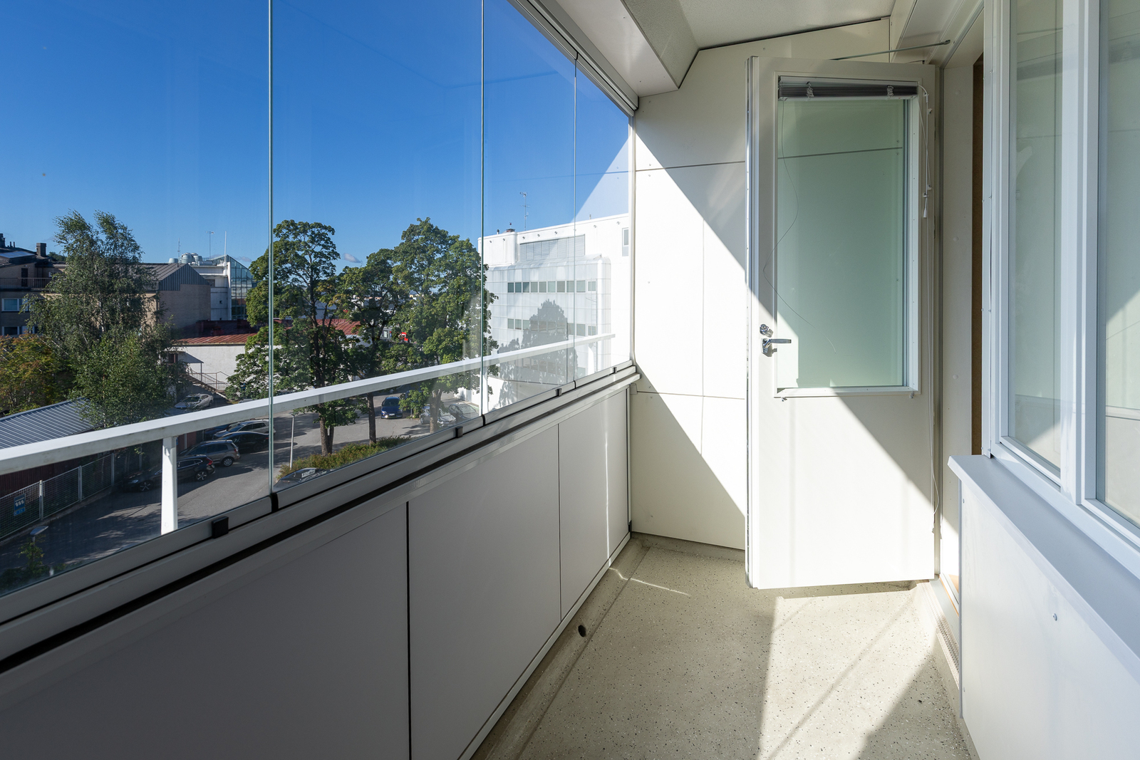 Asunnossa on selkeä pohjaratkaisu, tilavat huoneet ja lasitettu parveke, josta avautuu rauhallinen eteläsuuntainen näkymä. Kadun puolelta näkymä ulottuu aina historialliselle Pyhän Laurin kirkolle saakka – ainutlaatuinen yksityiskohta arjessa.