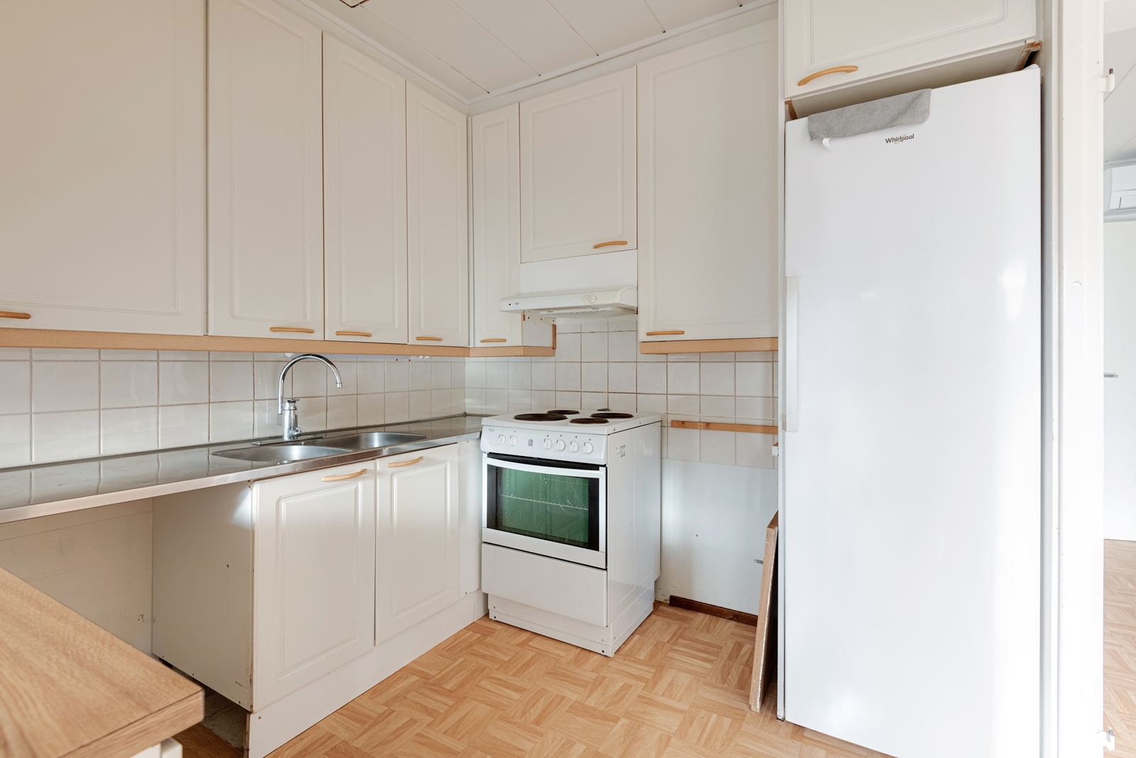Liesi (sähköliesi), työtasot (laminaatti), seinät (maali), lattiat (muovimatto), jääkaappipakastin, liesi, liesituuletin ja varattu paikka astianpesukoneelle |