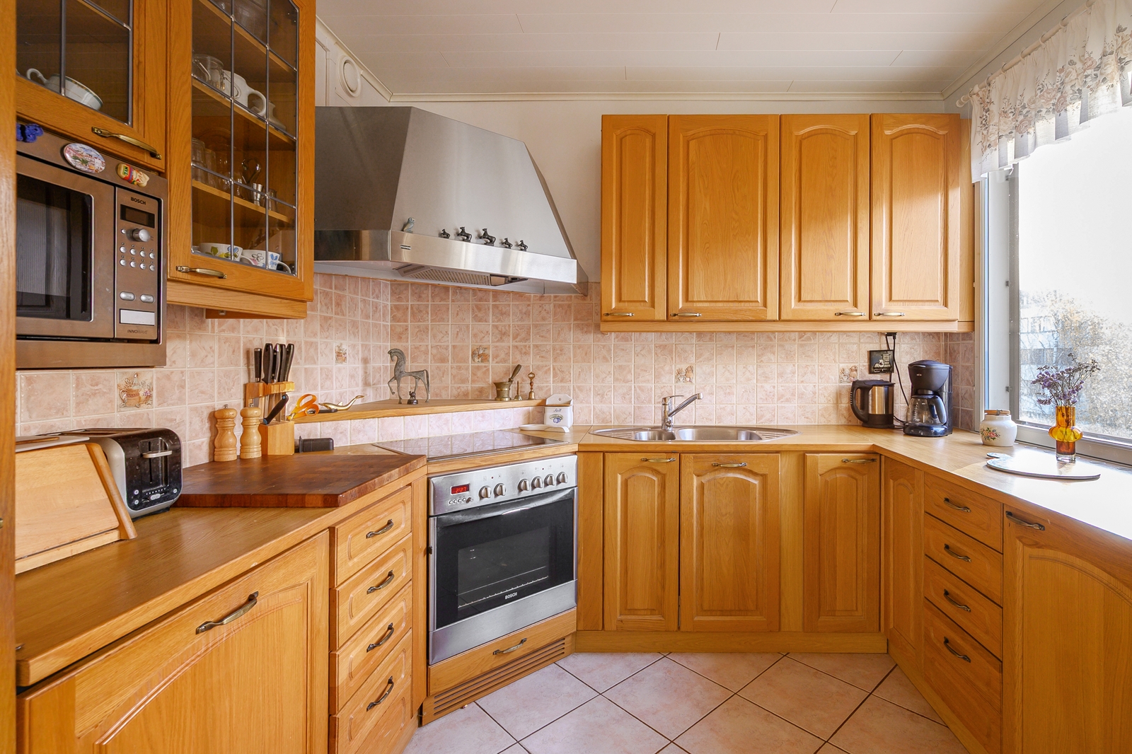 Liesi (Keraaminen liesi), työtasot (puu), seinät (laatta ja maali), lattiat (laatta), jääkaappi (Bosch), erillinen pakastin (Bosch), liesituuletin (Bosch), liesi (Bosch), erillisuuni (Bosch), mikroaaltouuni (Bosch), astianpesukone (Bosch) ja keittiösaareke |