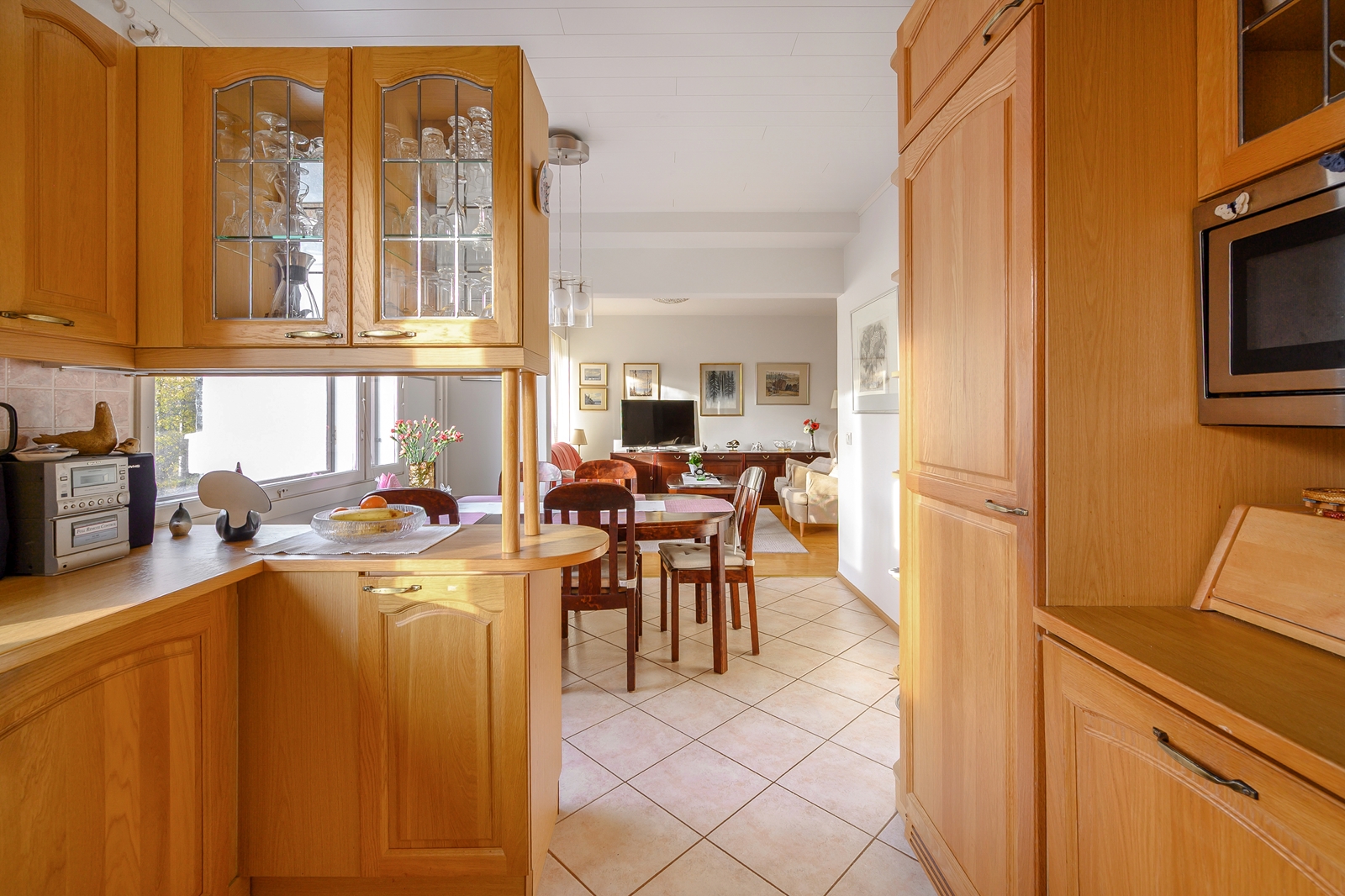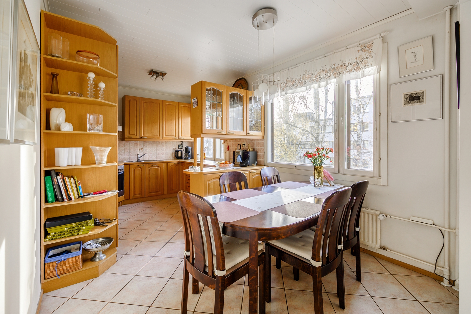 Keittiössä ja ruokailutilassa valkoinen panelikatto. |
