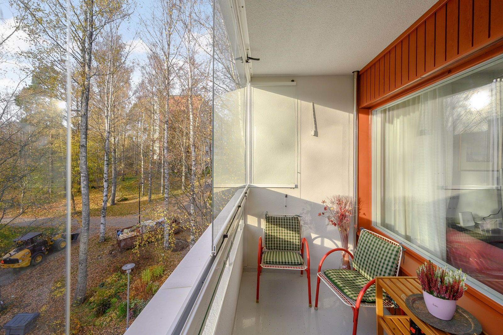 Asunnon parveke on lasitettu ja suuntautuu länteen, mikä tarjoaa mukavat näkymät piha-alueelle. Kolmannessa kerroksessa sijaitseva koti on osa hyvin hoidettua taloyhtiötä, jossa on käytössä muun muassa uima-allas ja lenkkisaunavuorot. Taloyhtiössä on myös kattavat säilytystilat, kuten kylmäkellari ja urheiluvälinevarasto.