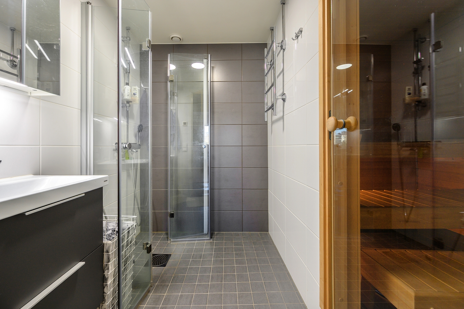 Seinät (puolipaneeli), lattiat (laatta), Sähkökiuas, Putkiremontissa 2020-2021 uusittu. |