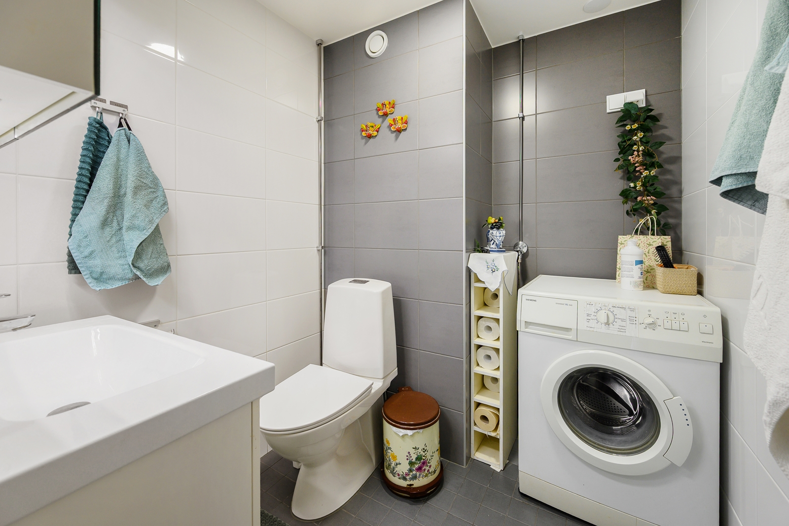 Lukumäärä: 1, WC-istuin, pesukoneliitäntä, allaskaappi ja peilikaappi, seinät (Kaakeli), lattiat (Laatta) |