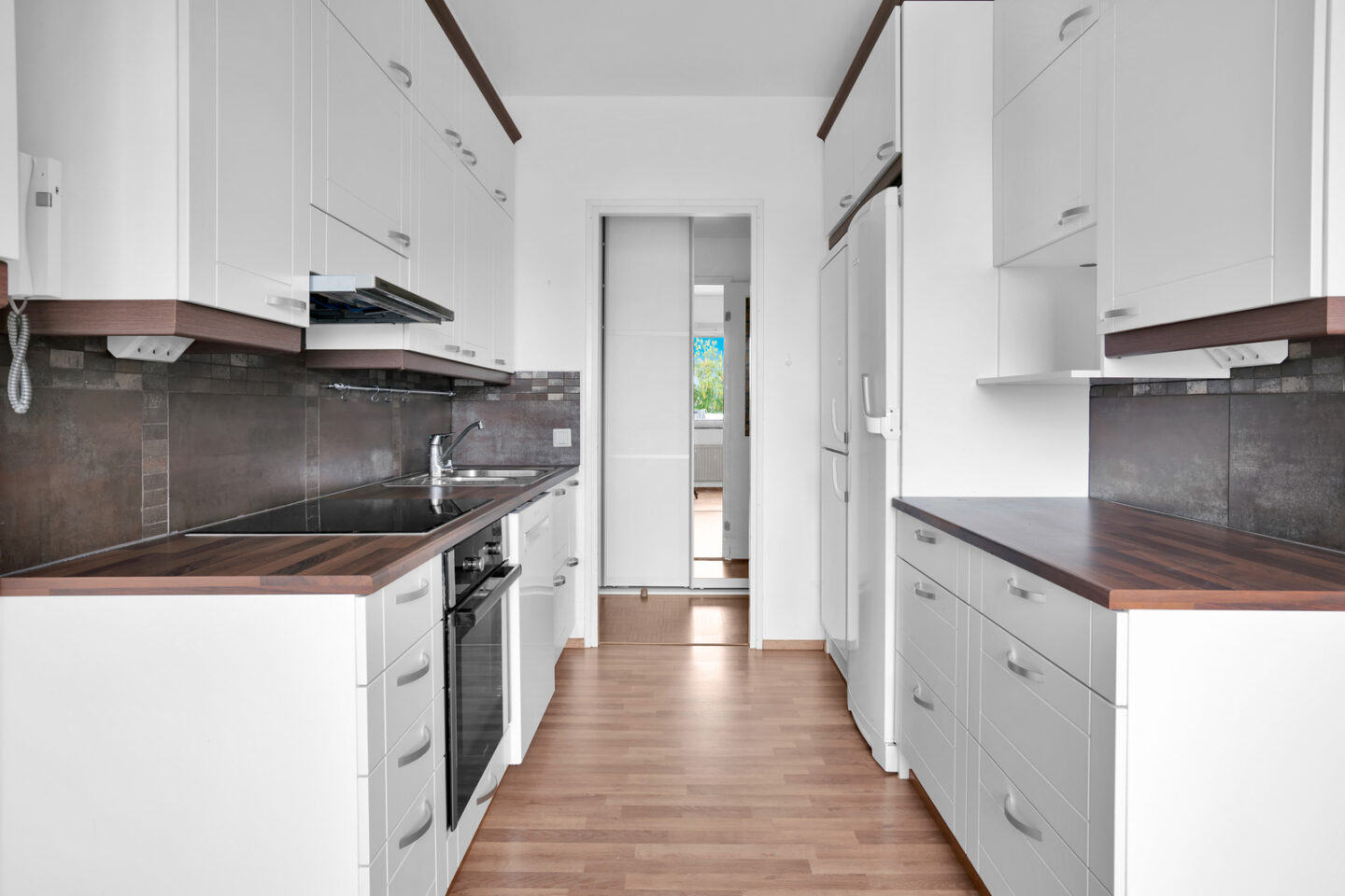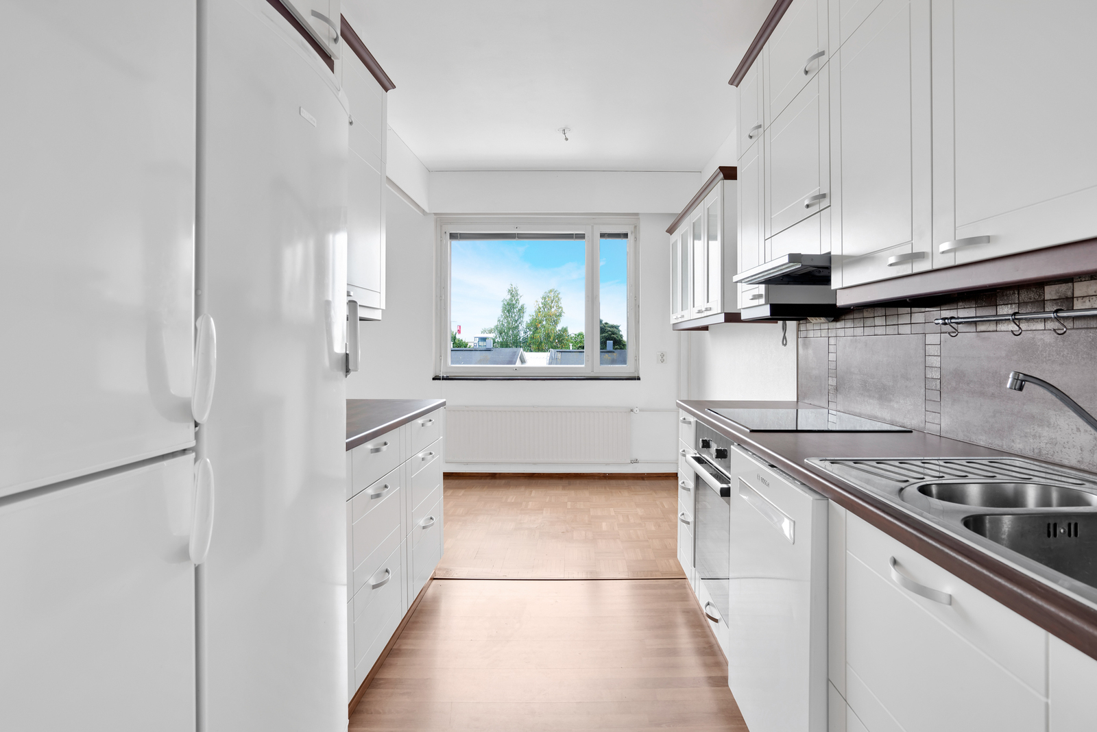 | Keittiön kuvaus | Liesi (Induktioliesi), työtasot (laminaatti), seinät (maali), lattiat (laminaatti), liesi, jääkaappi, jääkaappipakastin, liesituuletin, astianpesukone ja kiinteät valaisimet |
