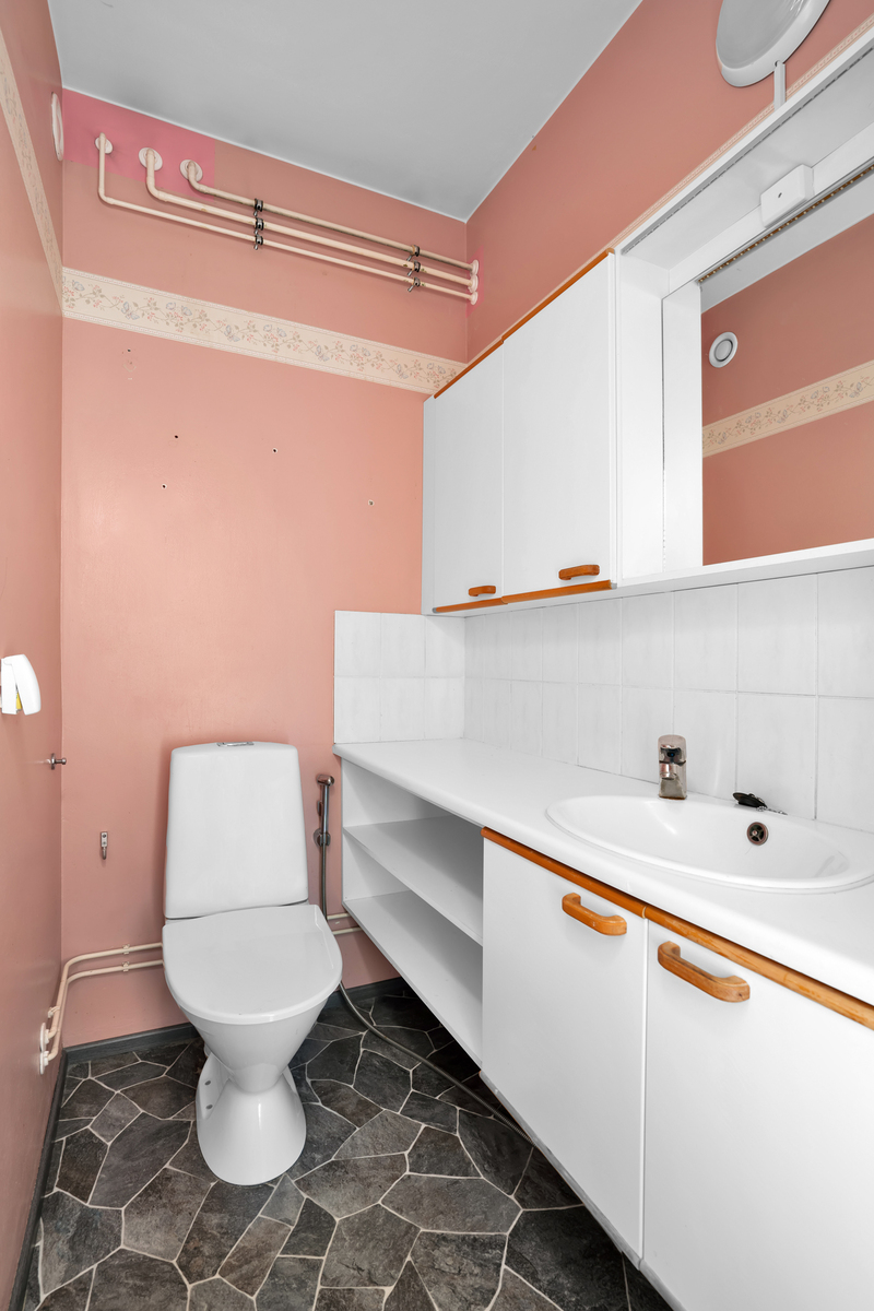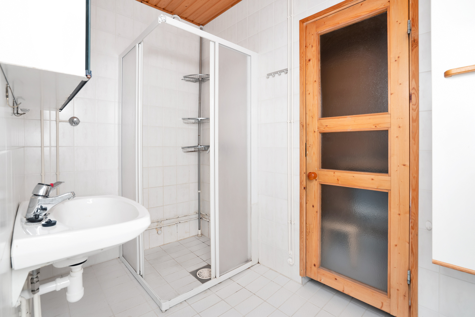| Kylpyhuoneen kuvaus | Peilikaappi, suihkuseinä, pesukoneliitäntä, suihku ja kiinteät valaisimet, seinät (kaakeli), lattiat (laatta) |