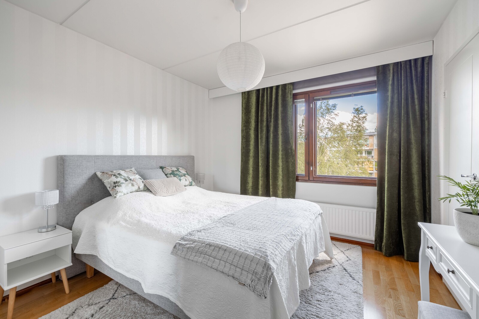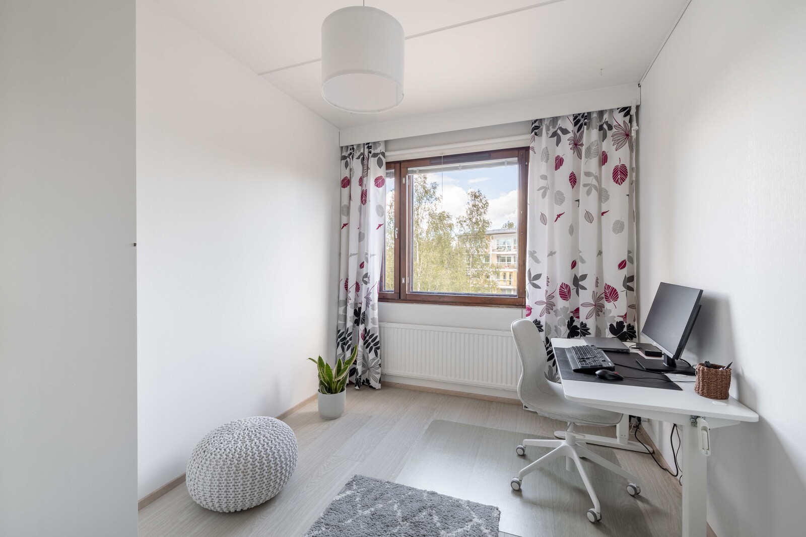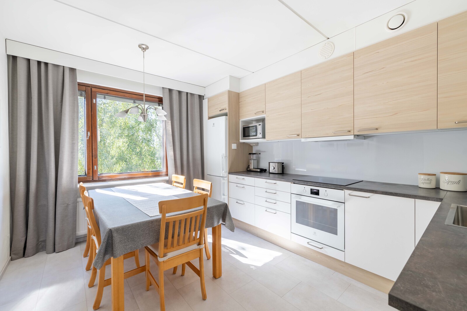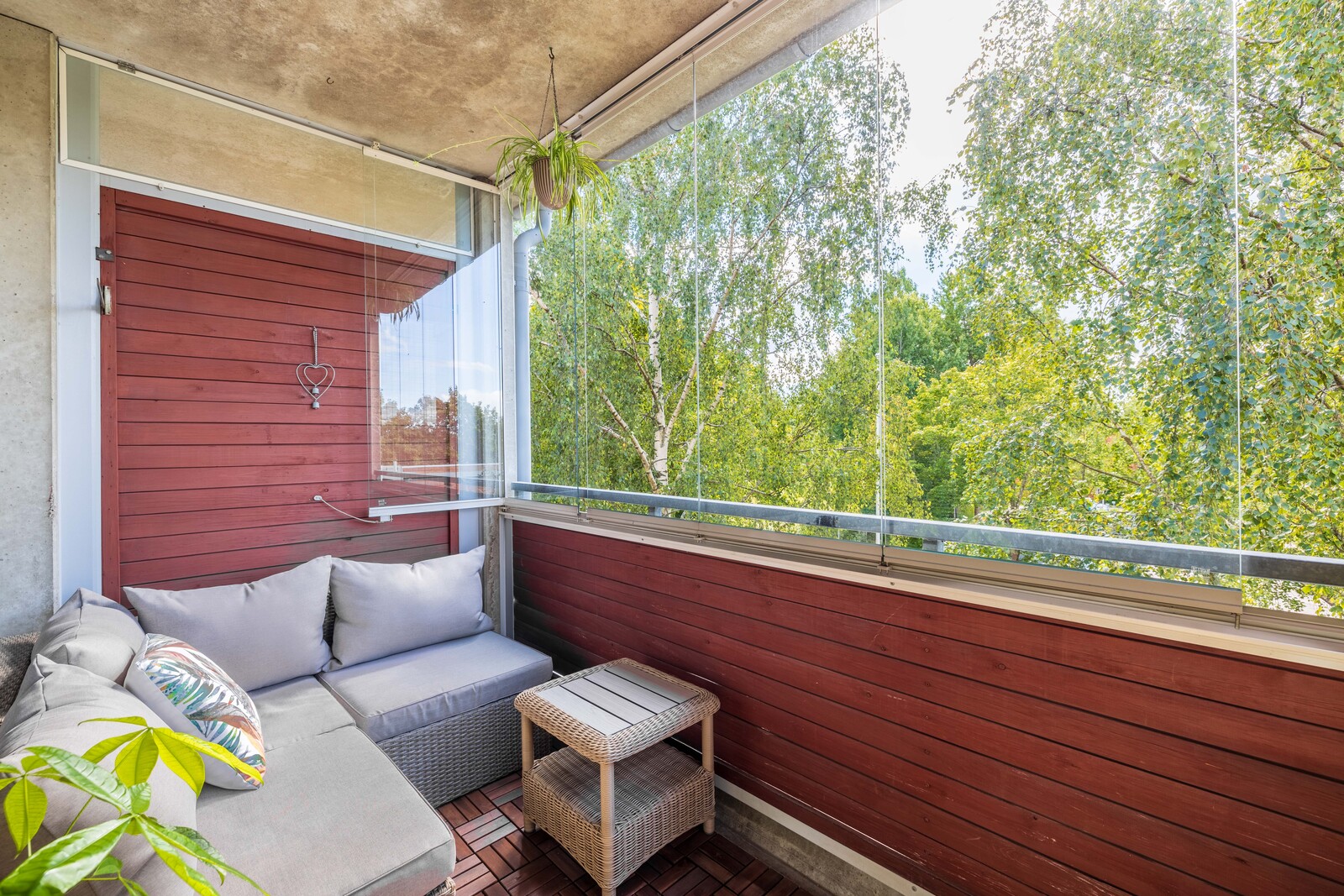 Asunnossa on kolme makuuhuonetta, reilunkokoinen olohuone, iso ja valoisa keittiö sekä parveke, jossa on tilaa nauttia lämpimistä kesäpäivistä. Koti on läpitalon huoneisto ja ikkunoista avautuu kauniit näkymät vehreään piha-alueeseen.