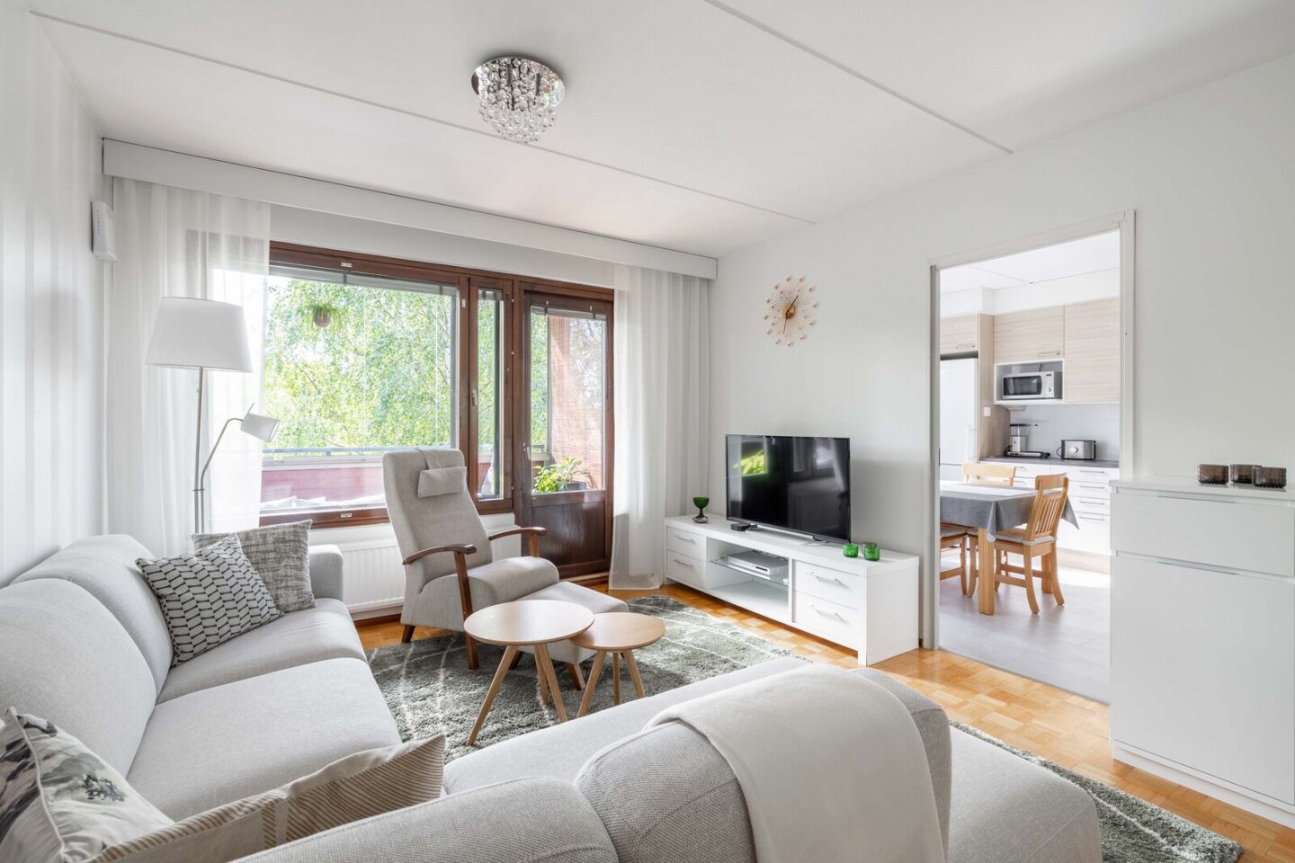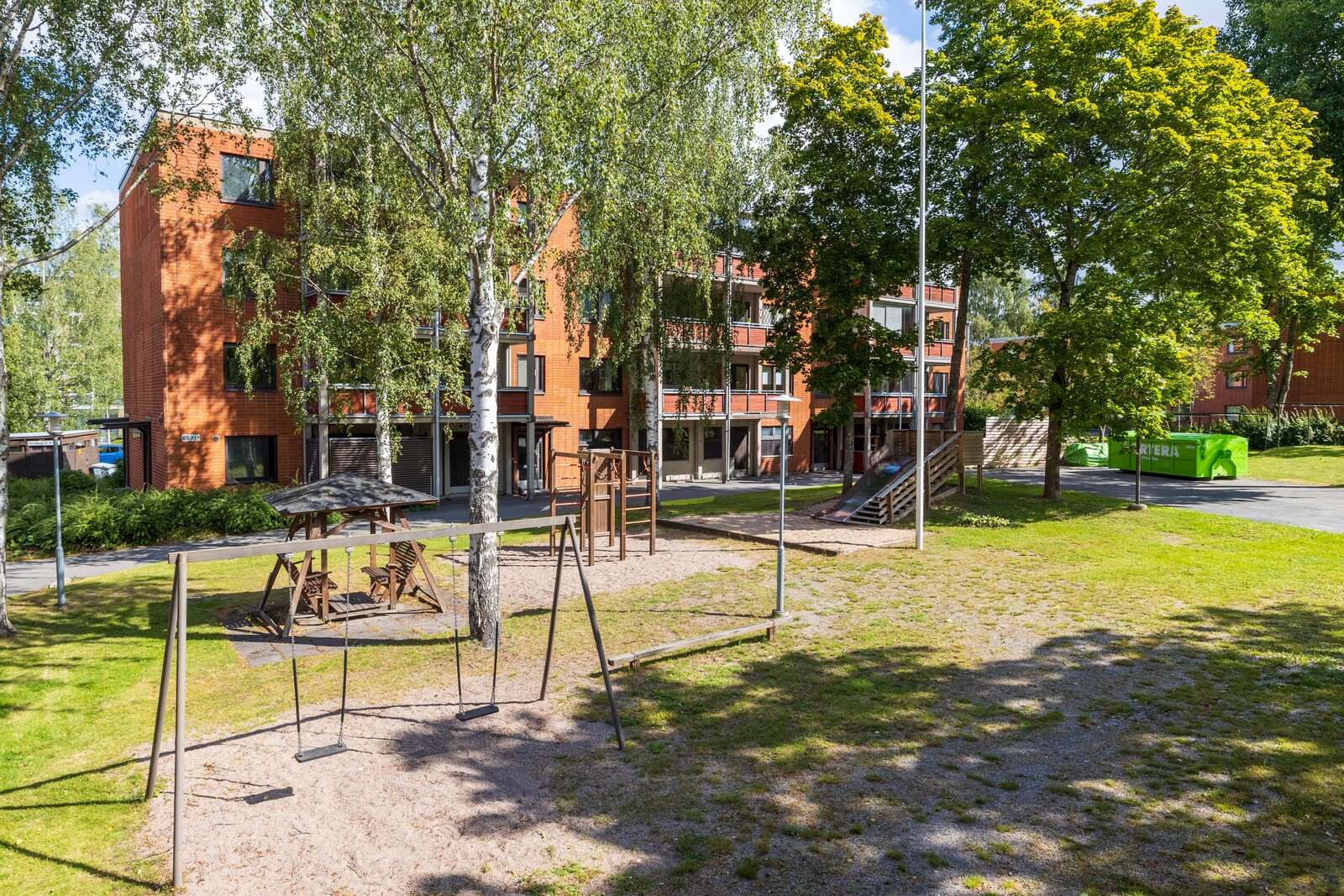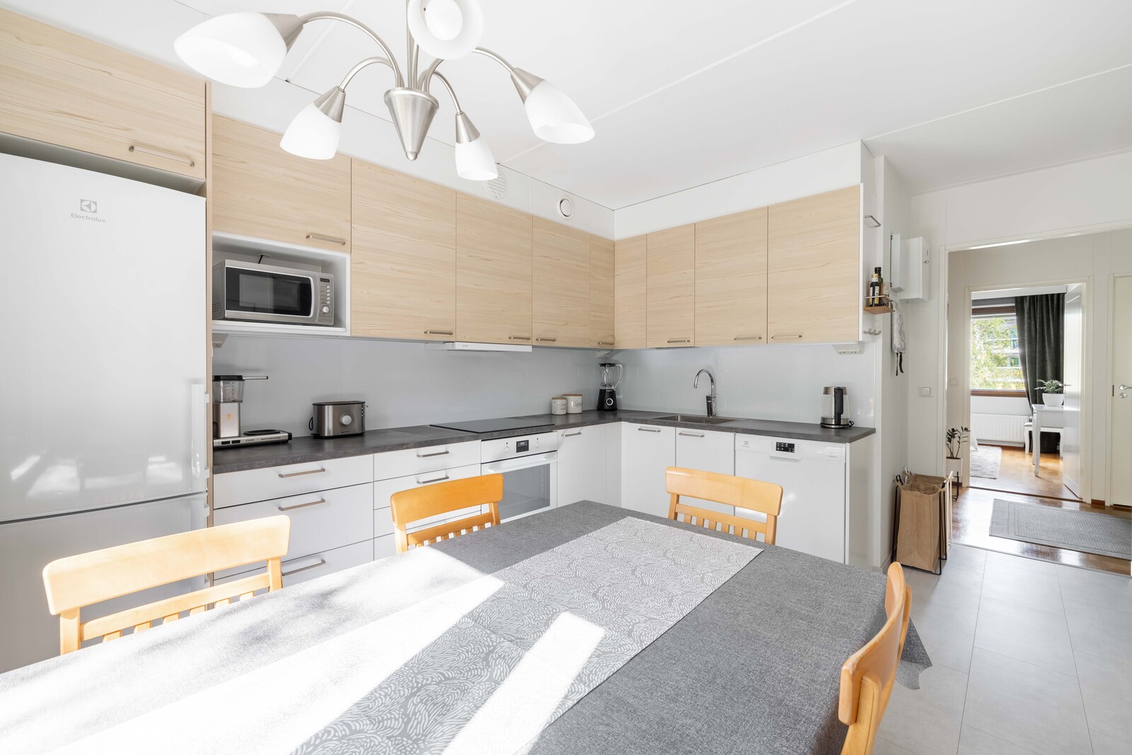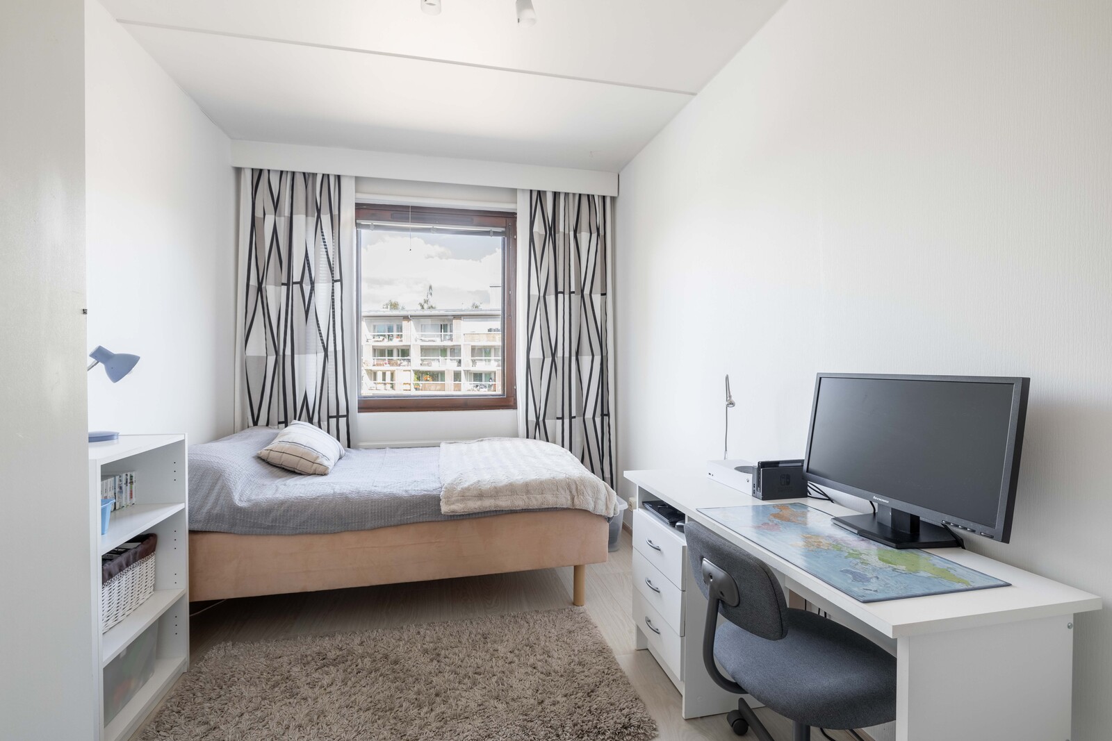 Asunnossa on kolme makuuhuonetta, reilunkokoinen olohuone, iso ja valoisa keittiö sekä parveke, jossa on tilaa nauttia lämpimistä kesäpäivistä. Koti on läpitalon huoneisto ja ikkunoista avautuu kauniit näkymät vehreään piha-alueeseen.