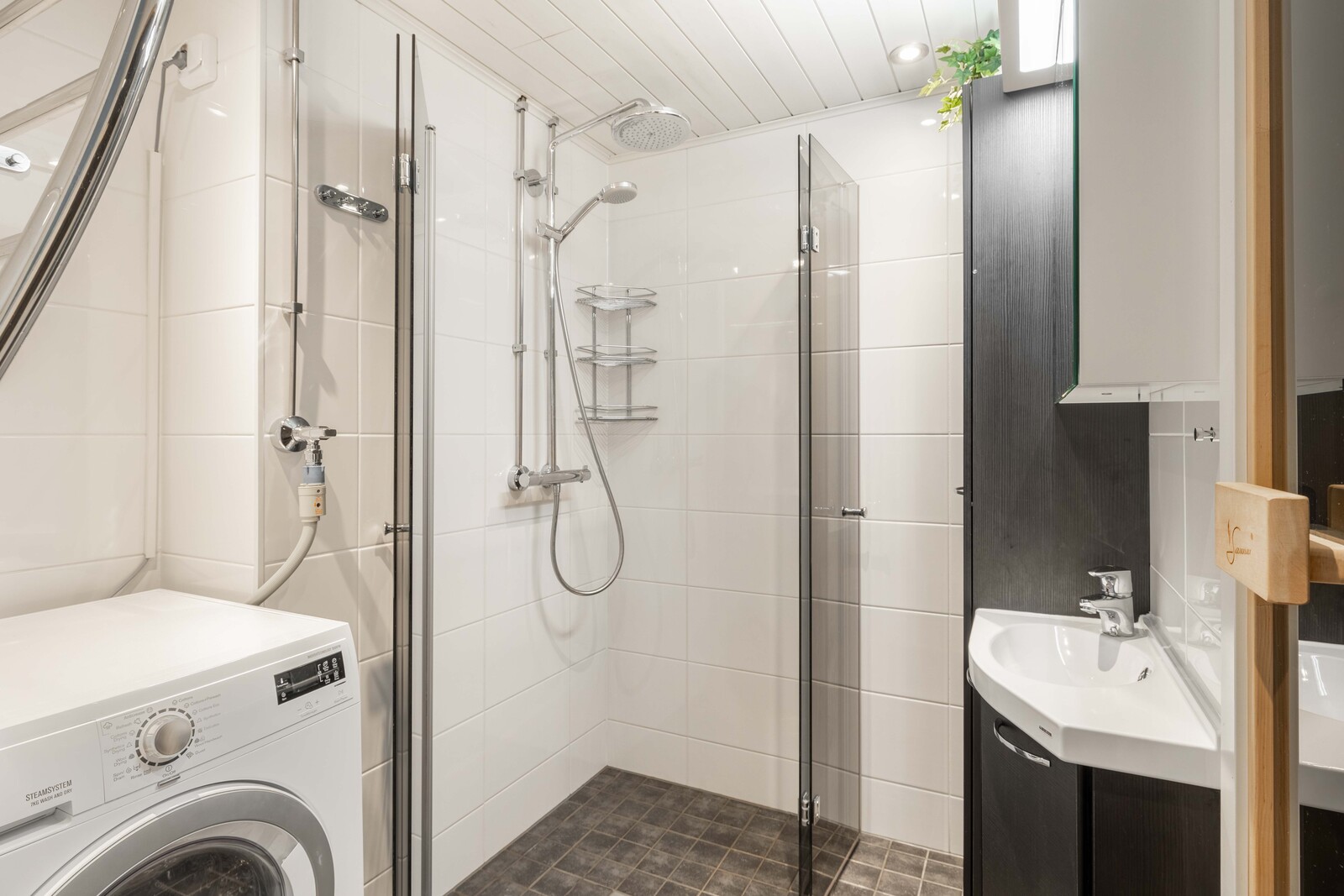 | Kylpyhuoneen kuvaus | Lattialämmitys, peilikaappi, suihkuseinä, pesukoneliitäntä ja asennettuja erikoisvarusteita, kiinteät valaisimet, seinät (kaakeli), lattiat (laatta), kph ja sauna remontoitu v. 2018 |