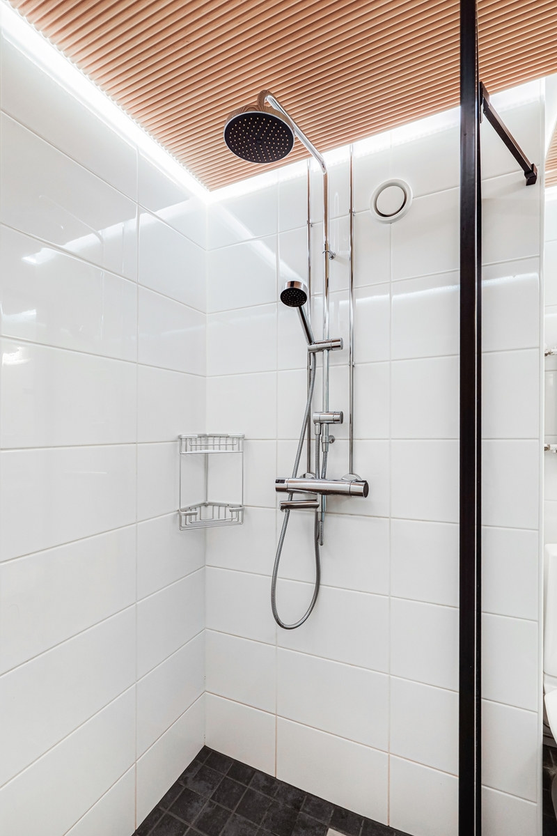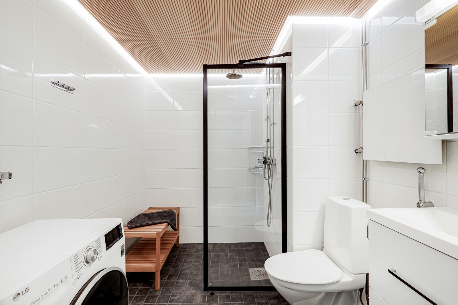 Pesukoneliitäntä, lattialämmitys, suihkuseinä, peilikaappi, wc-istuin, suihku ja kiinteät valaisimet, asennettuja erikoisvarusteita, seinät (kaakeli), lattiat (laatta) |