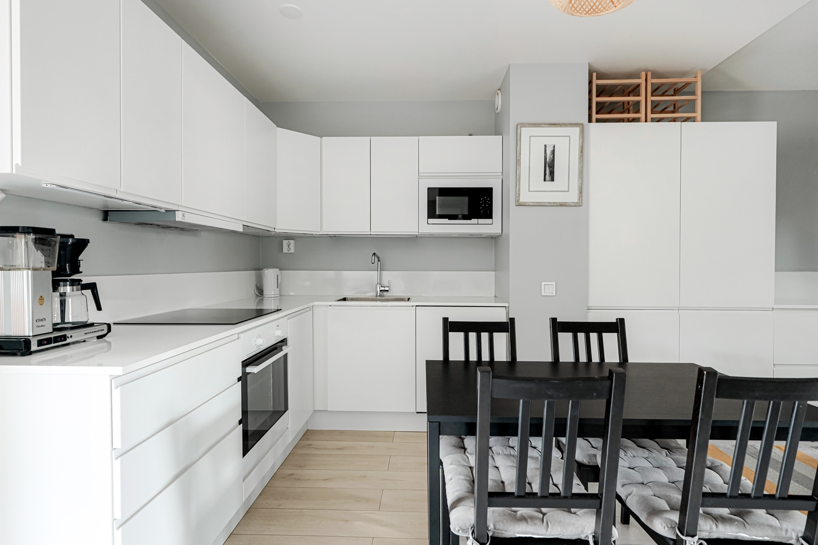 Liesi (Induktioliesi ja erillisuuni), työtasot (laminaatti), seinät (maali), lattiat (vinyyli), liesi, astianpesukone, erillisuuni, jääkaappipakastin, mikroaaltouuni, liesituuletin ja kiinteät valaisimet |