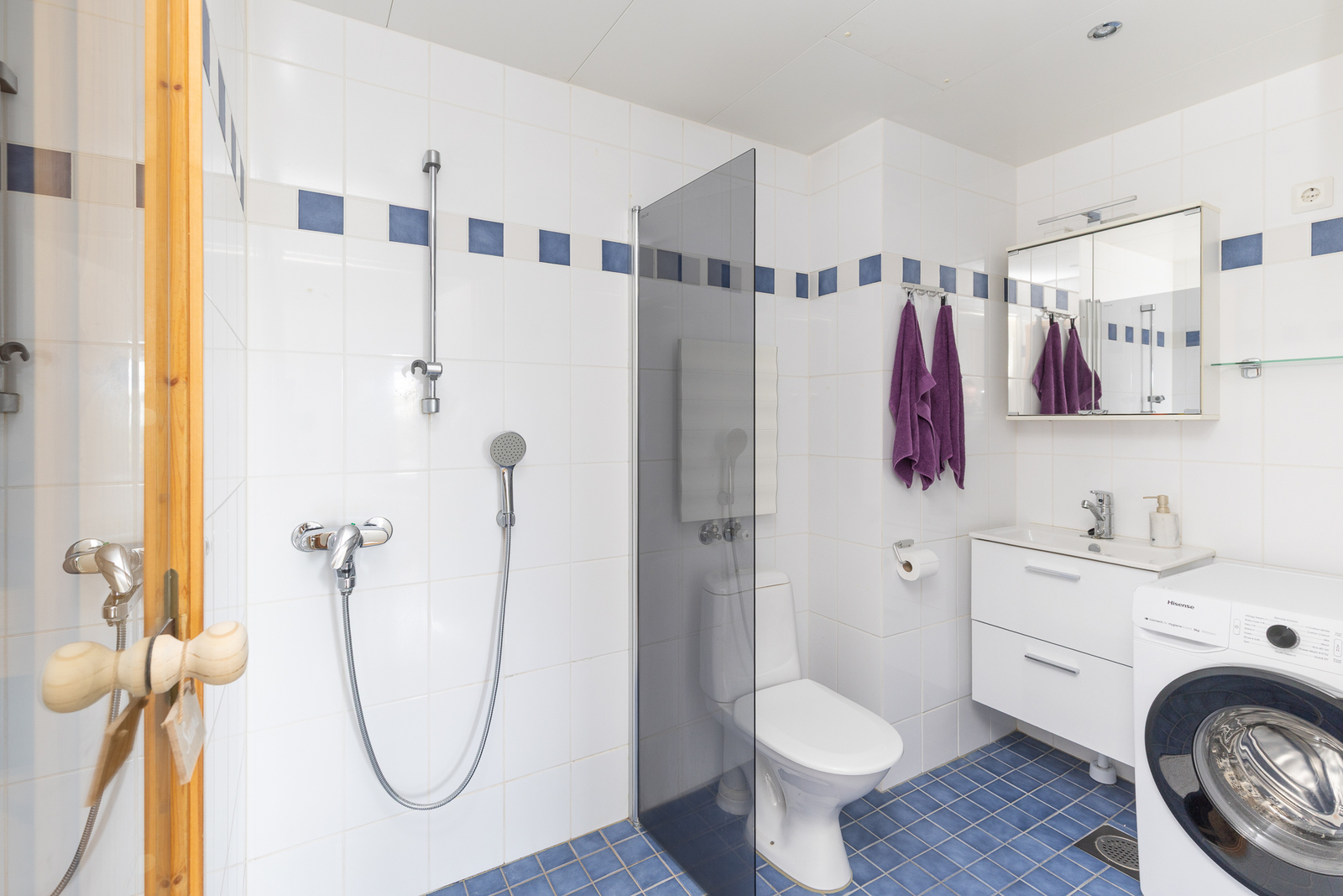 | Kylpyhuoneen kuvaus | Suihkuseinä, pesukoneliitäntä, wc-istuin, peilikaappi, suihku, lattialämmitys ja kiinteät valaisimet, seinät (kaakeli), lattiat (laatta) |