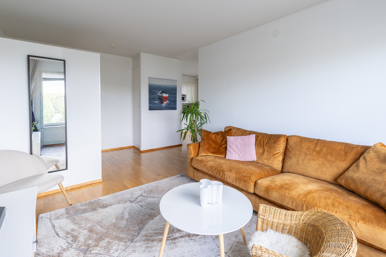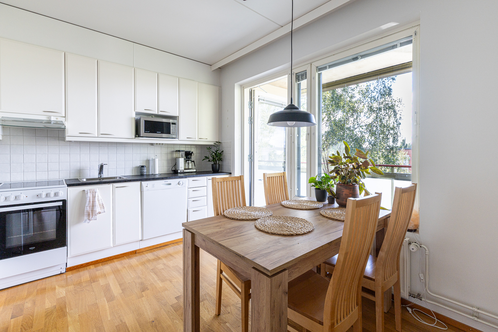 Keittiö on hyvin varusteltu, ja sieltä löytyy muun muassa astianpesukone ja keraaminen liesi. Olohuoneen ja keittiön lattiat ovat kaunista parkettia, mikä luo yhtenäisen ilmeen koko asuntoon. Parvekkeelta avautuvat upeat etelän suuntaiset näkymät, jotka tuovat luonnonvaloa sisään koko päivän ajan.