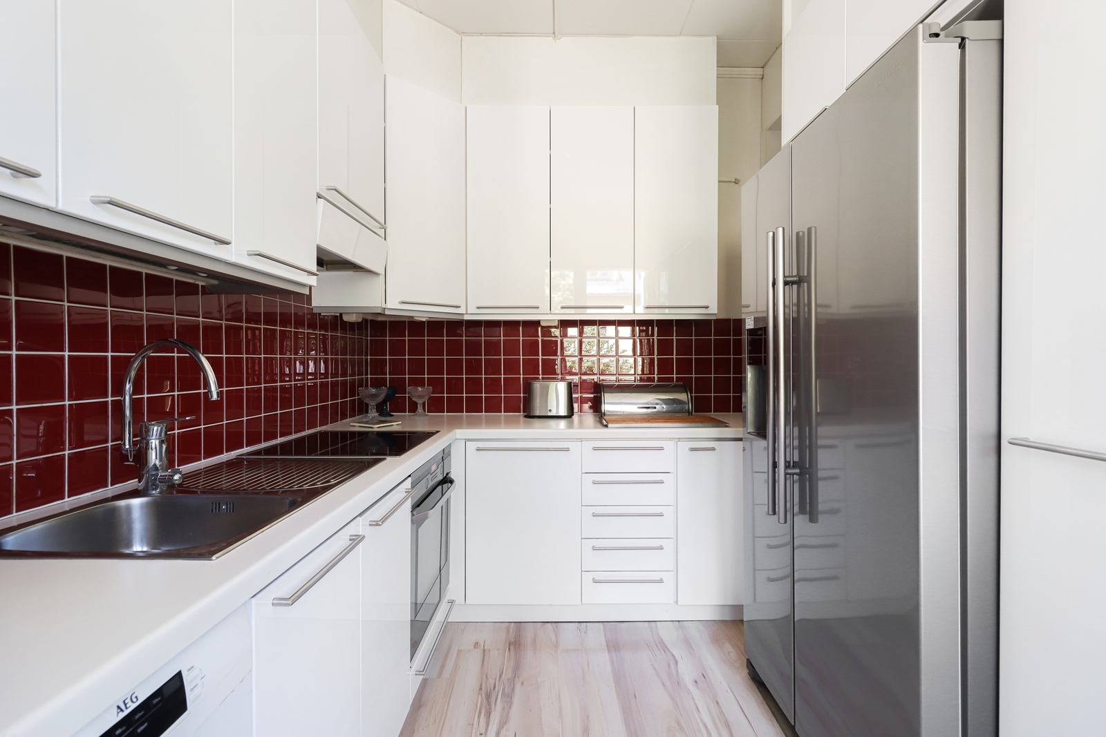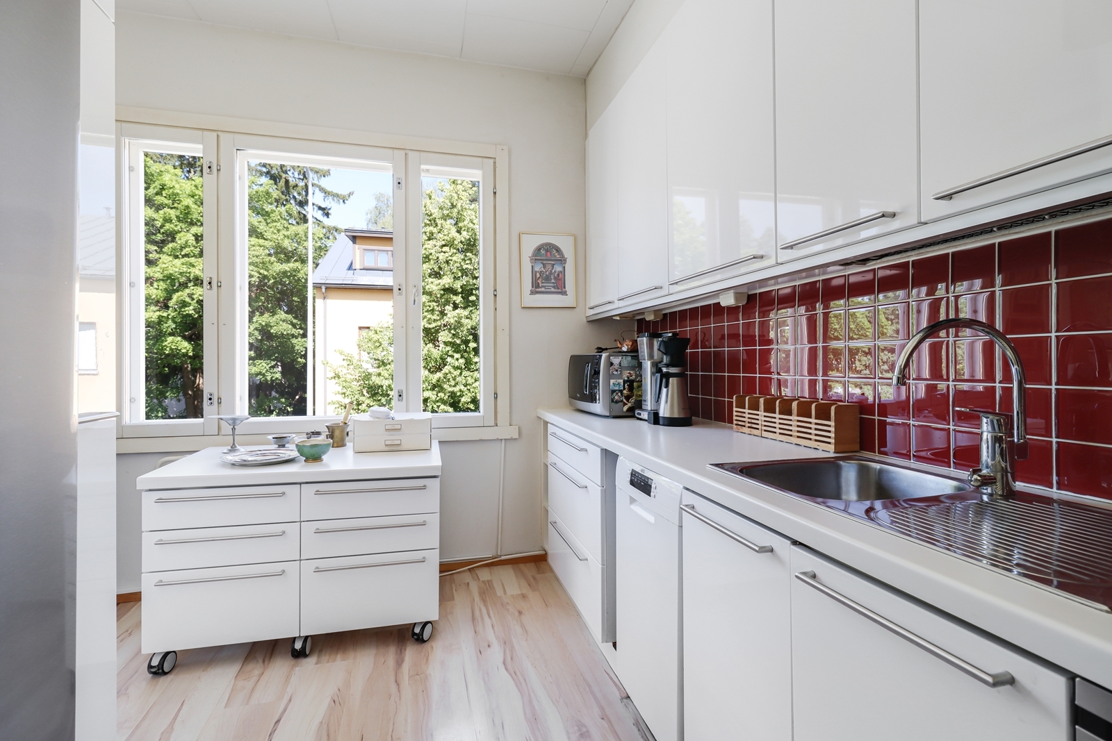 Liesi (Induktioliesi ja erillisuuni), seinät (maali), lattiat (laminaatti), jääkaappipakastin, astianpesukone, liesi, erillisuuni, liesituuletin ja irralliset kaapistot, kiinteät valaisimet |