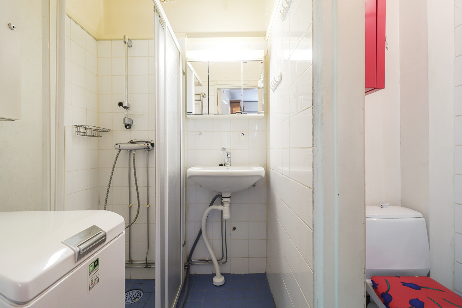 Pesukone, pesukoneliitäntä, wc-istuin, peilikaappi, suihku, suihkukaappi ja kiinteät valaisimet, seinät (kaakeli), lattiat (laatta) |