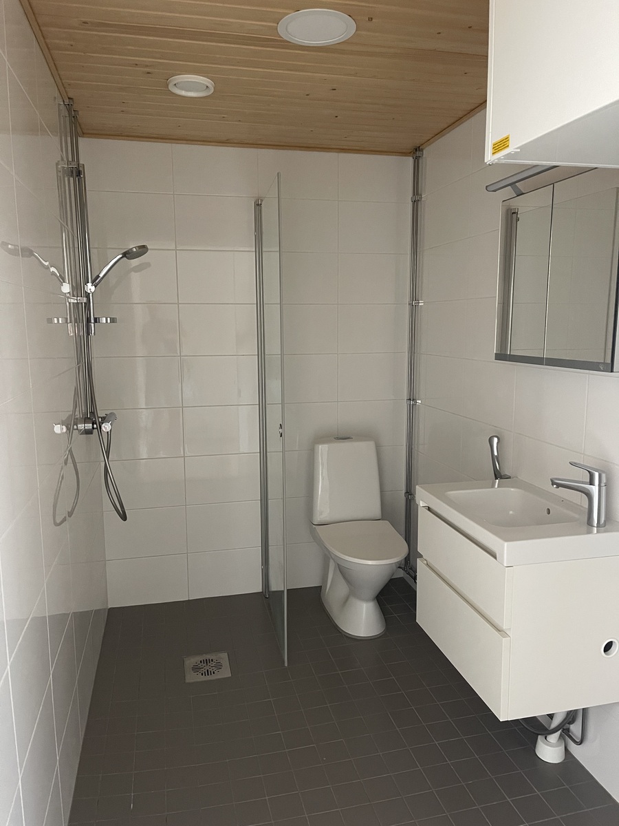 | Kylpyhuoneen kuvaus | Pesukoneliitäntä, lattialämmitys, suihkuseinä, peilikaappi, suihku, wc-istuin ja kiinteät valaisimet, seinät (kaakeli), lattiat (laatta), bidee-suihku |