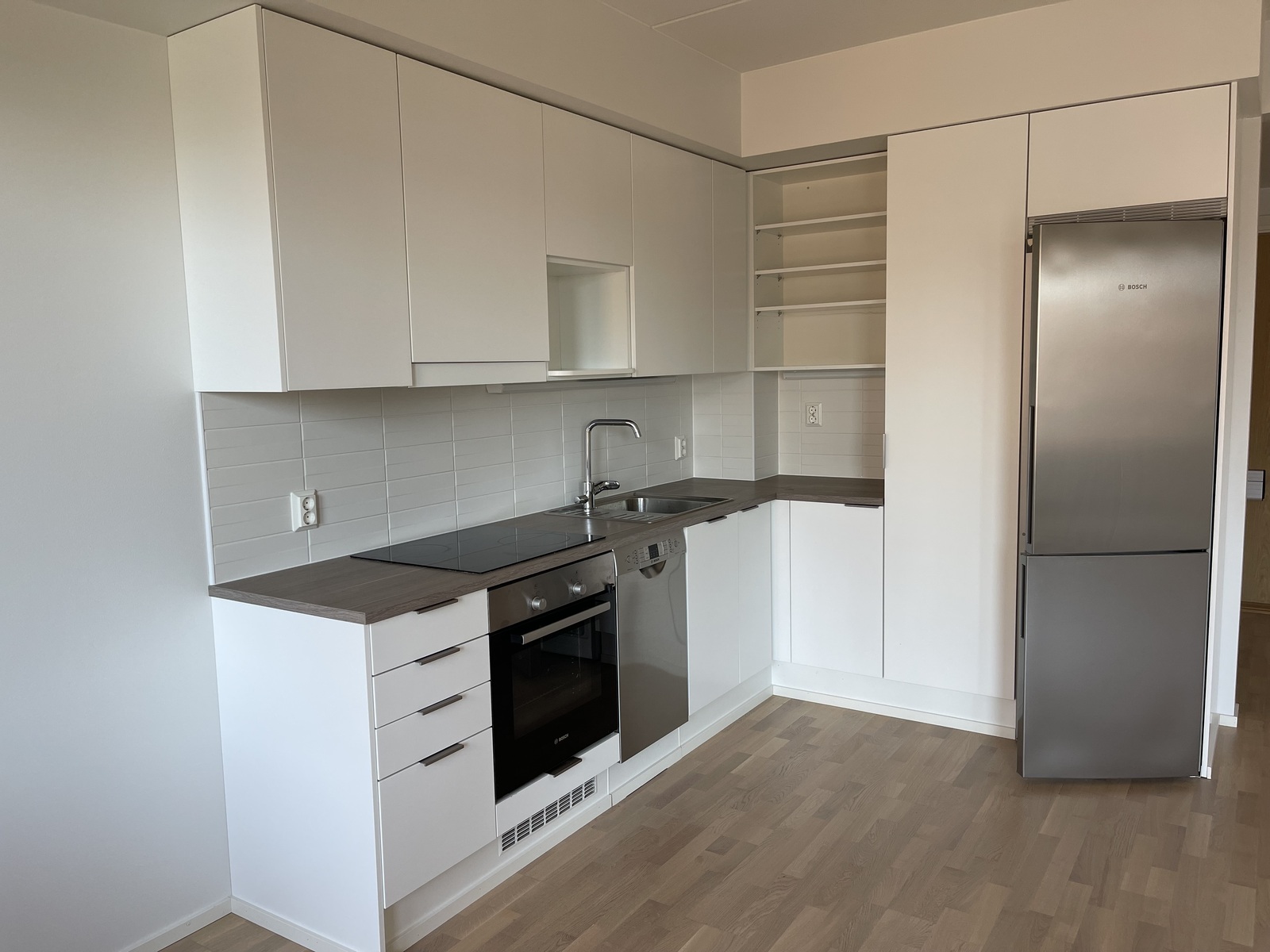 | Keittiön kuvaus | Liesi (Keraaminen liesi ja erillisuuni), työtasot (laminaatti), seinät (maali), lattiat (laminaatti), astianpesukone, erillisuuni, jääkaappipakastin, liesituuletin ja kiinteät valaisimet, valkoiset kaapistot ja välitilalaatat |